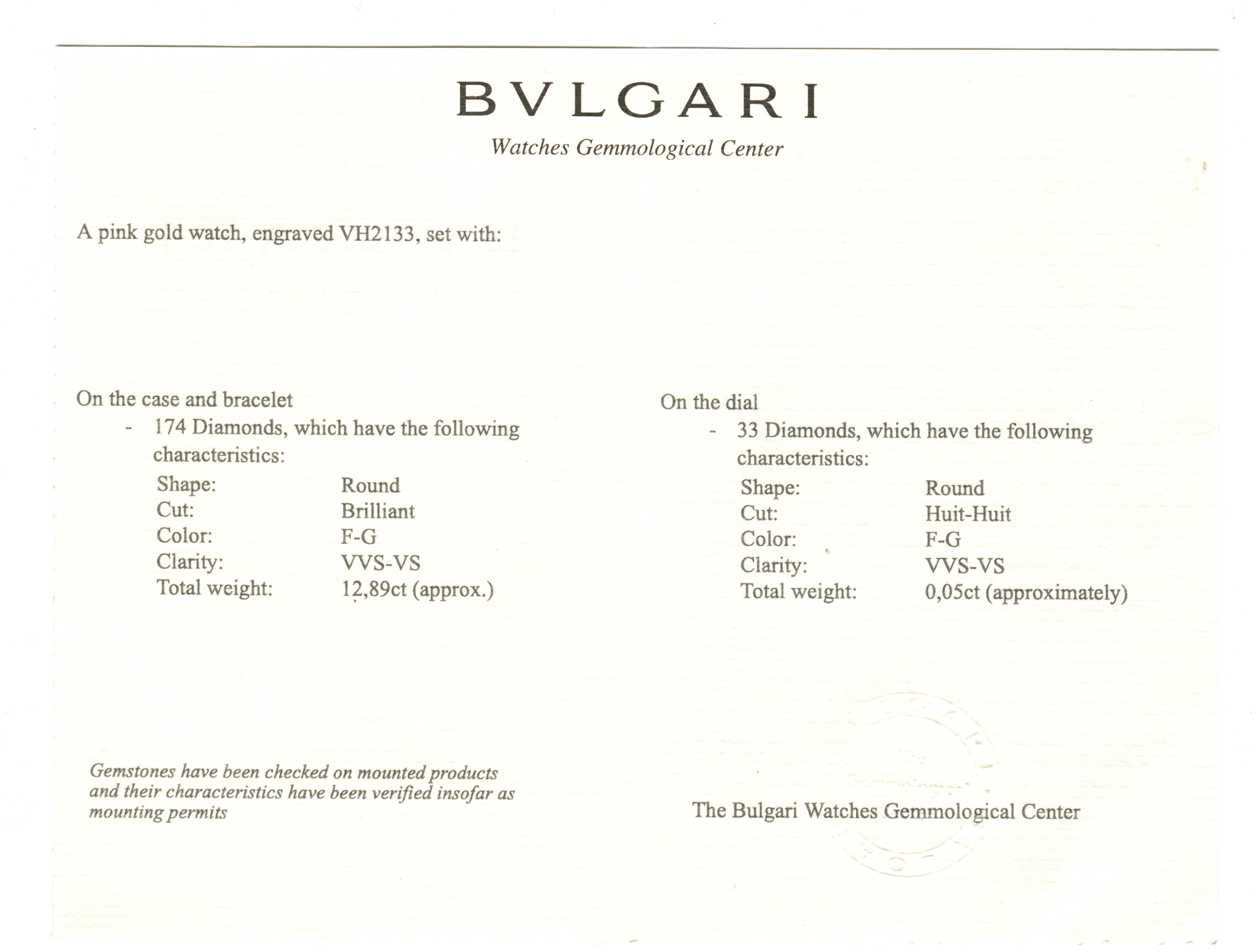 Composed of round brilliant-cut diamonds arranged on the scales of the snake and featuring a mother-of-pearl dial as the serpent head.Round brilliant and single-cut diamonds weighing a total of approximately 12.90 caratsMother-of-pearl dialSigned BvlgariSP P 26 G VH 2133Quartz movementNot currently running18 karat rose goldTotal weight 83.70 gramsInterior circumference 6¾ inches, width 1⅛ inches