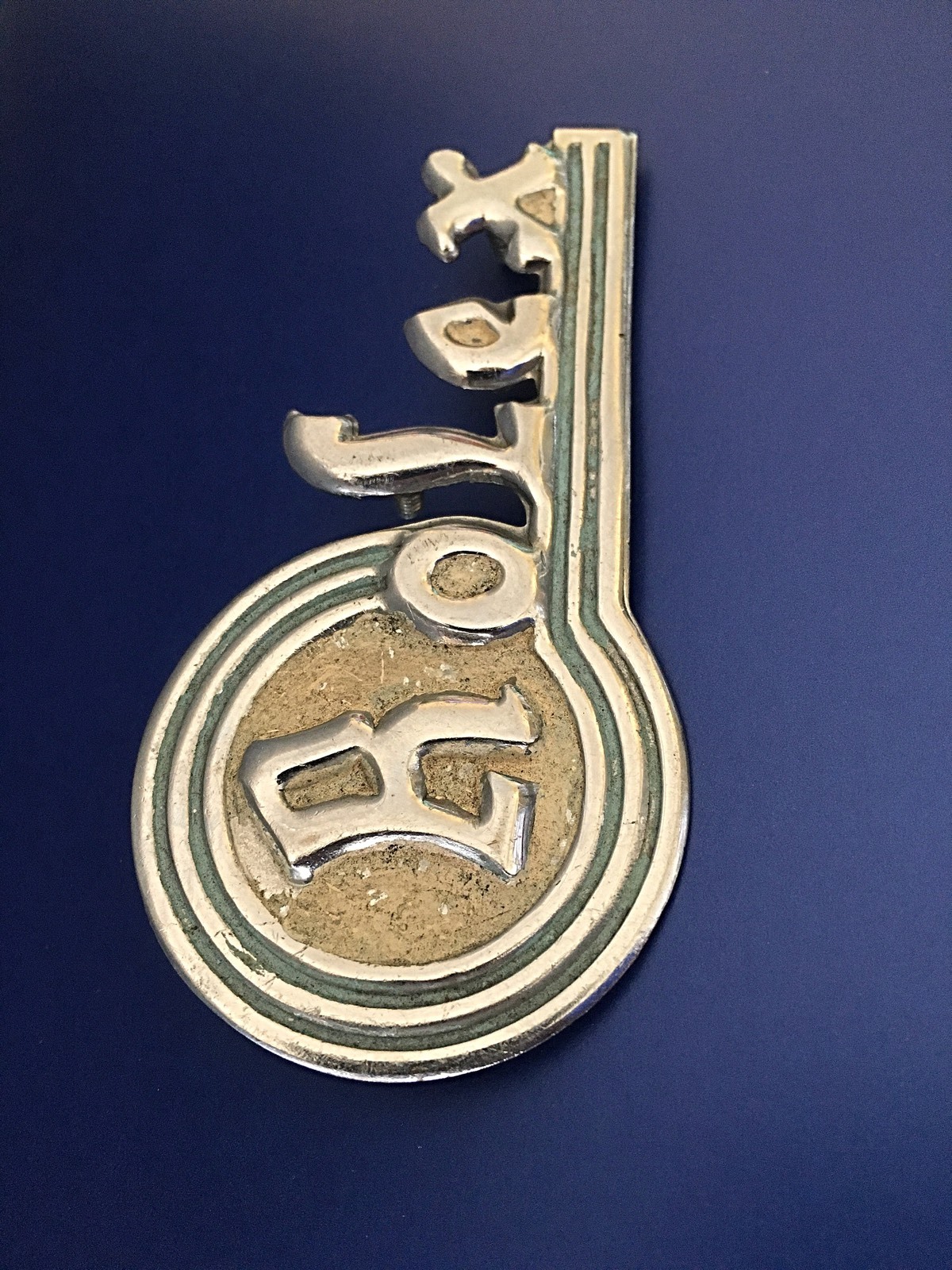 The sign has three original feet in the back which would have likely gone into a display case or wall. The sign had some wear marks and part of the white and blue enamel inside the sign has some chipping. Please see photos.