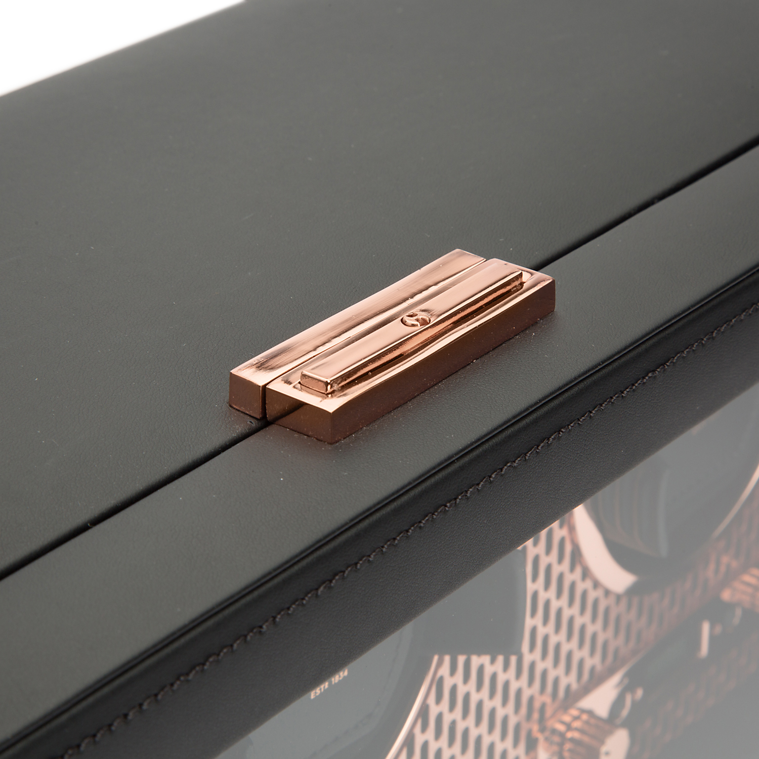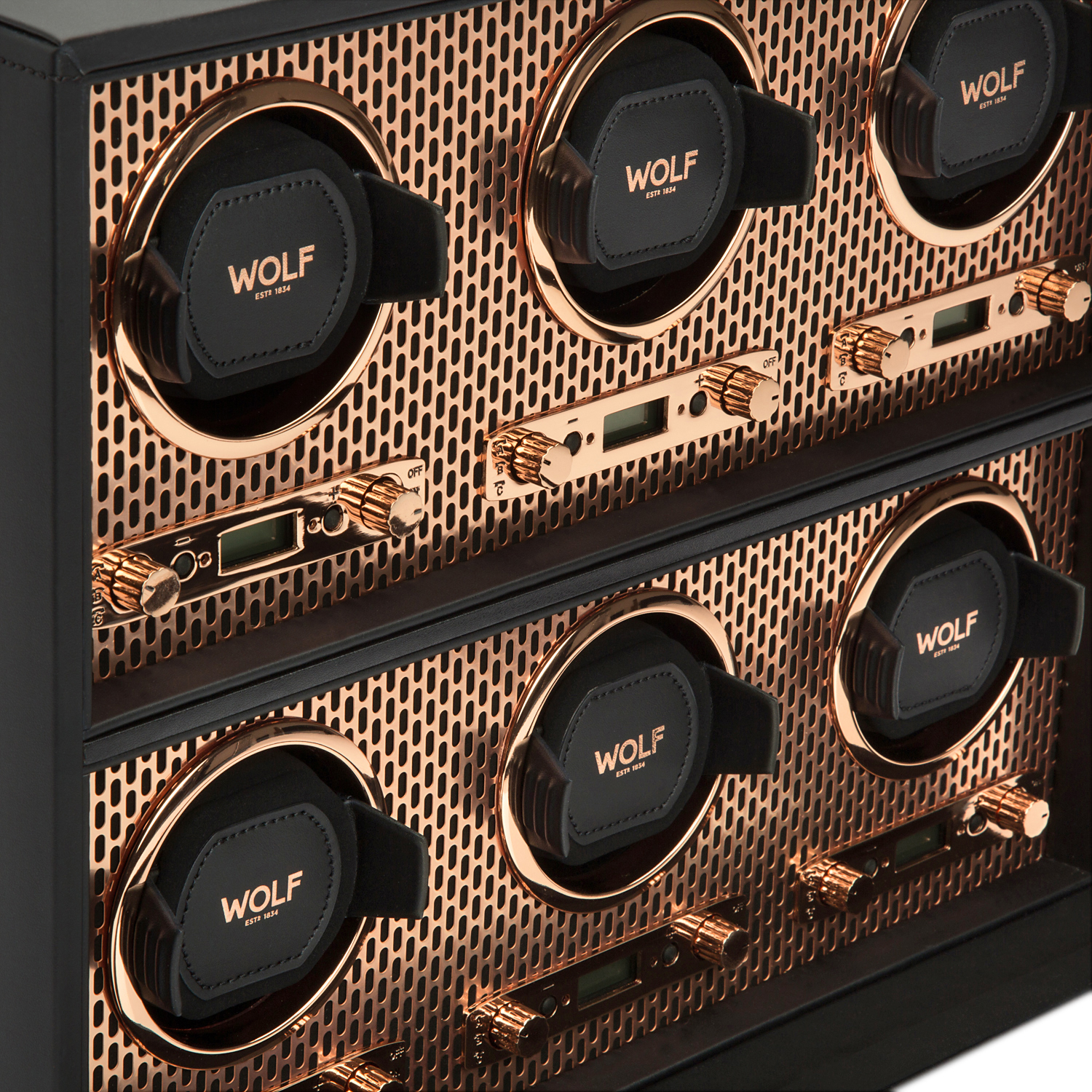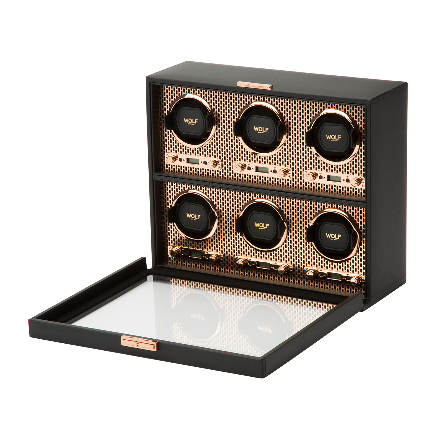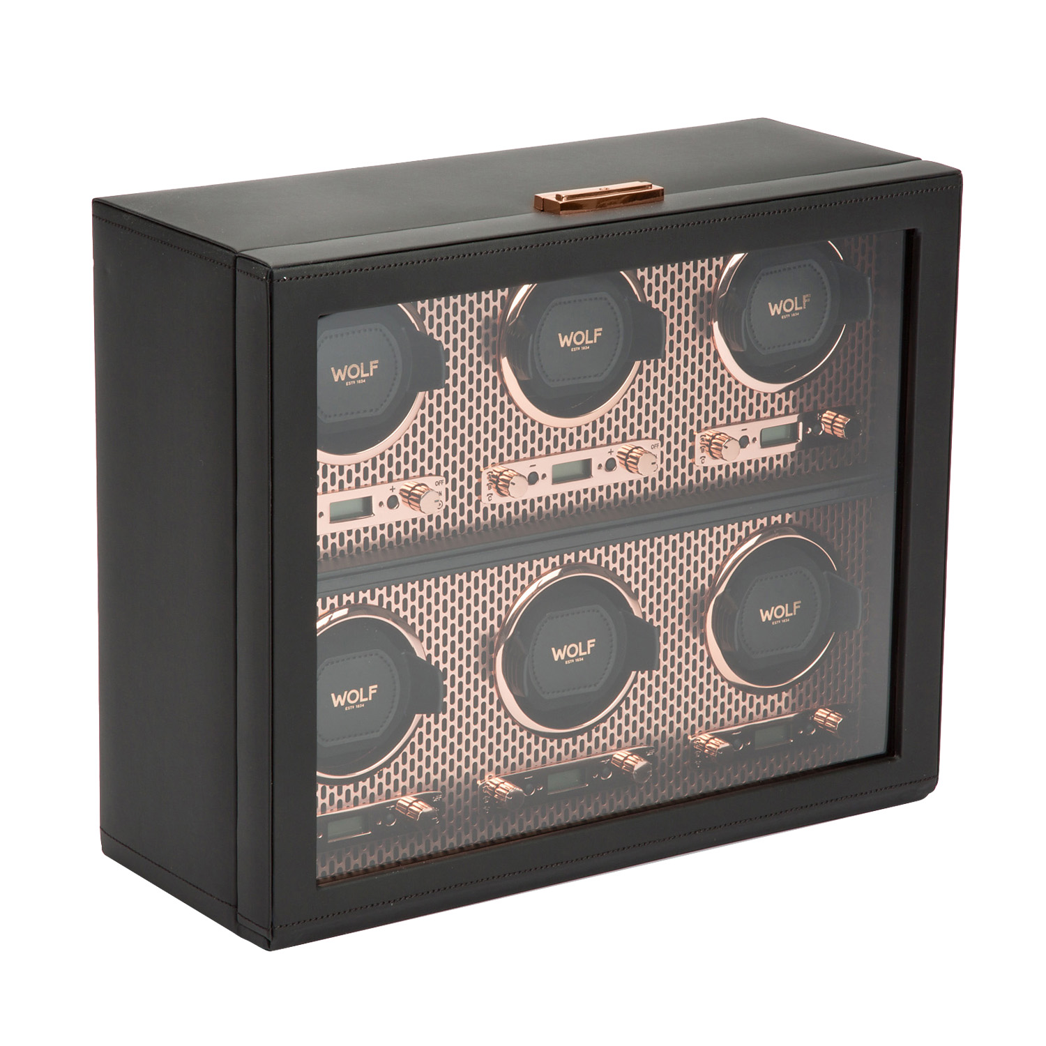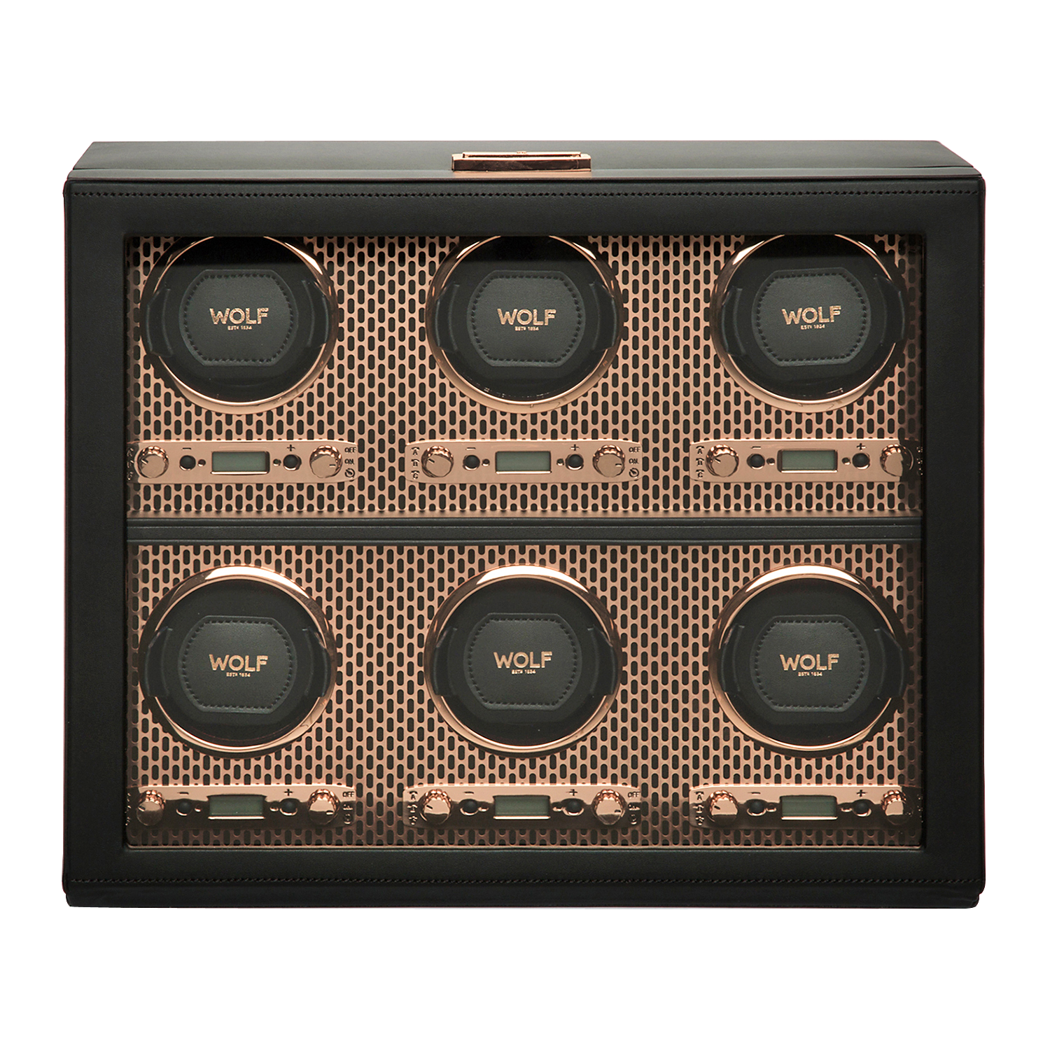 Powder-coated and copper plated laser cut perforated steel melded with clean, sleek lines. AXIS drives a modern, bold look for safekeeping your timepieces. Our patented technology of counting rotations of the axis of your watch guarantees precise turns per day. Bold luxury, faultless design, take AXIS for a spin in the 6pc watch winder.  Patented Innovation – Every WOLF winder counts the precise number of rotations. All other winders estimate the number of rotations. Lock-in dynamic cuff: Patented lock-in dynamic cuff ‘locks’ your timepiece into the rotator drum for a secure fit. Low density foam to accommodate all wrist sizes without putting pressure on your braceletRotation options: 10 second start delay. Can be set between 300 and 1,200 TPD (turns per day). Double the amount of TPD by selecting bi-directional settingDirectional settings: Clockwise, counter clockwise and bi-directionalVegan Leather