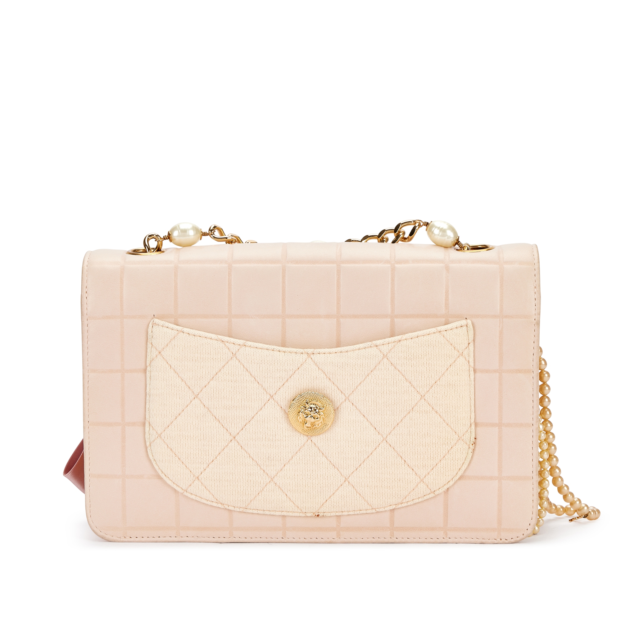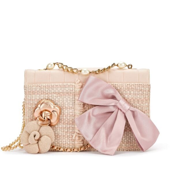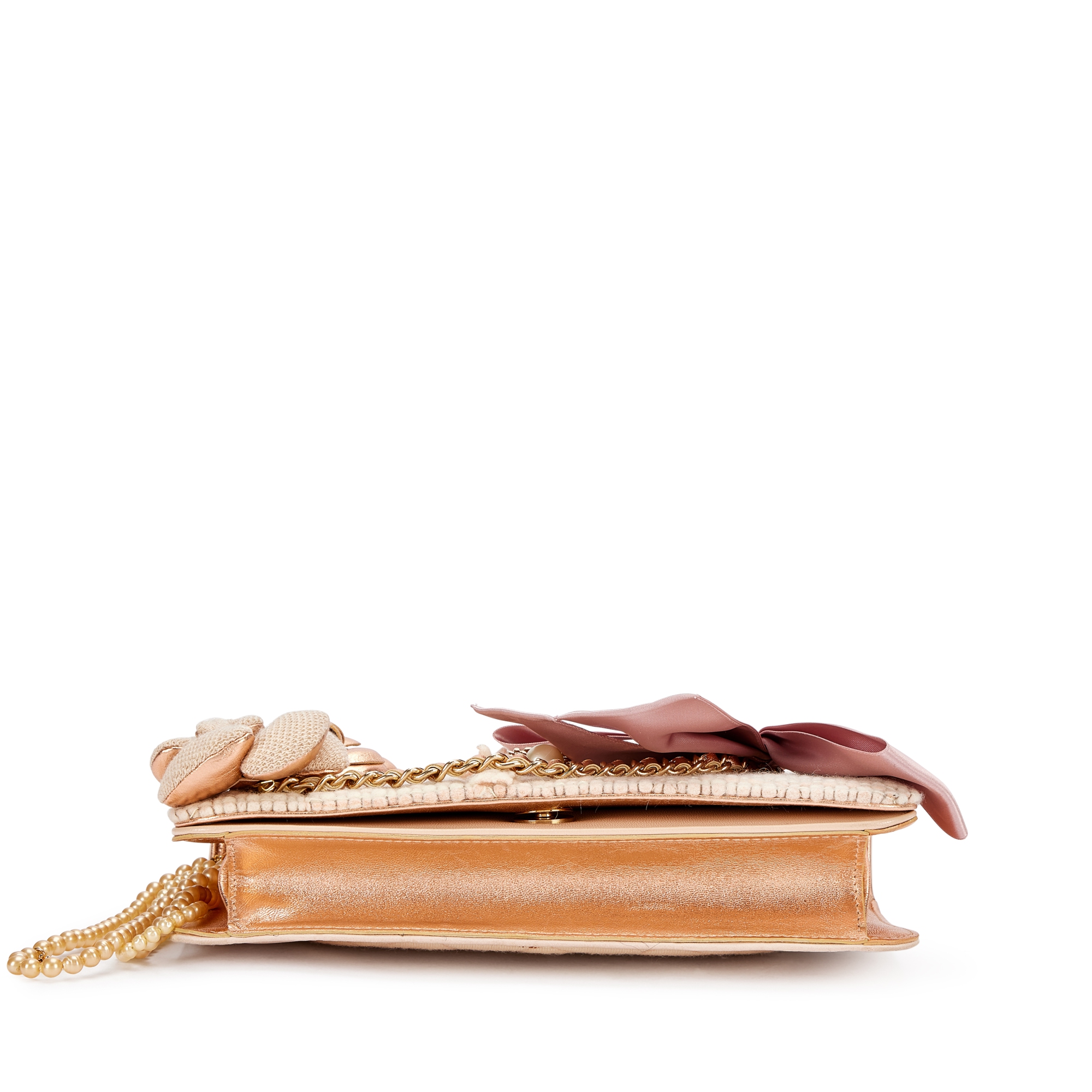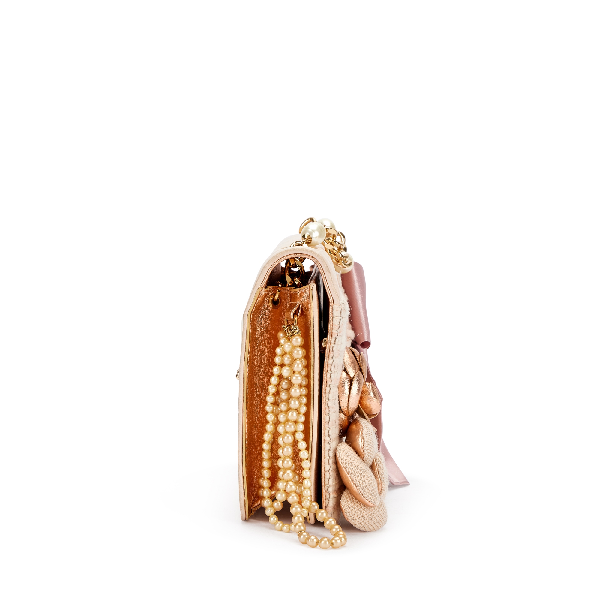 Chanel Beige and Pink Lambskin, Tweed, Imitation Pearl, Ribbon and Camellia Flap Bag Gold Hardware, 2002-03The interior is lined with Rose Gold leatherIncludes authenticity card, care booklet, dust bag and boxThis item is final sale and not eligible for return