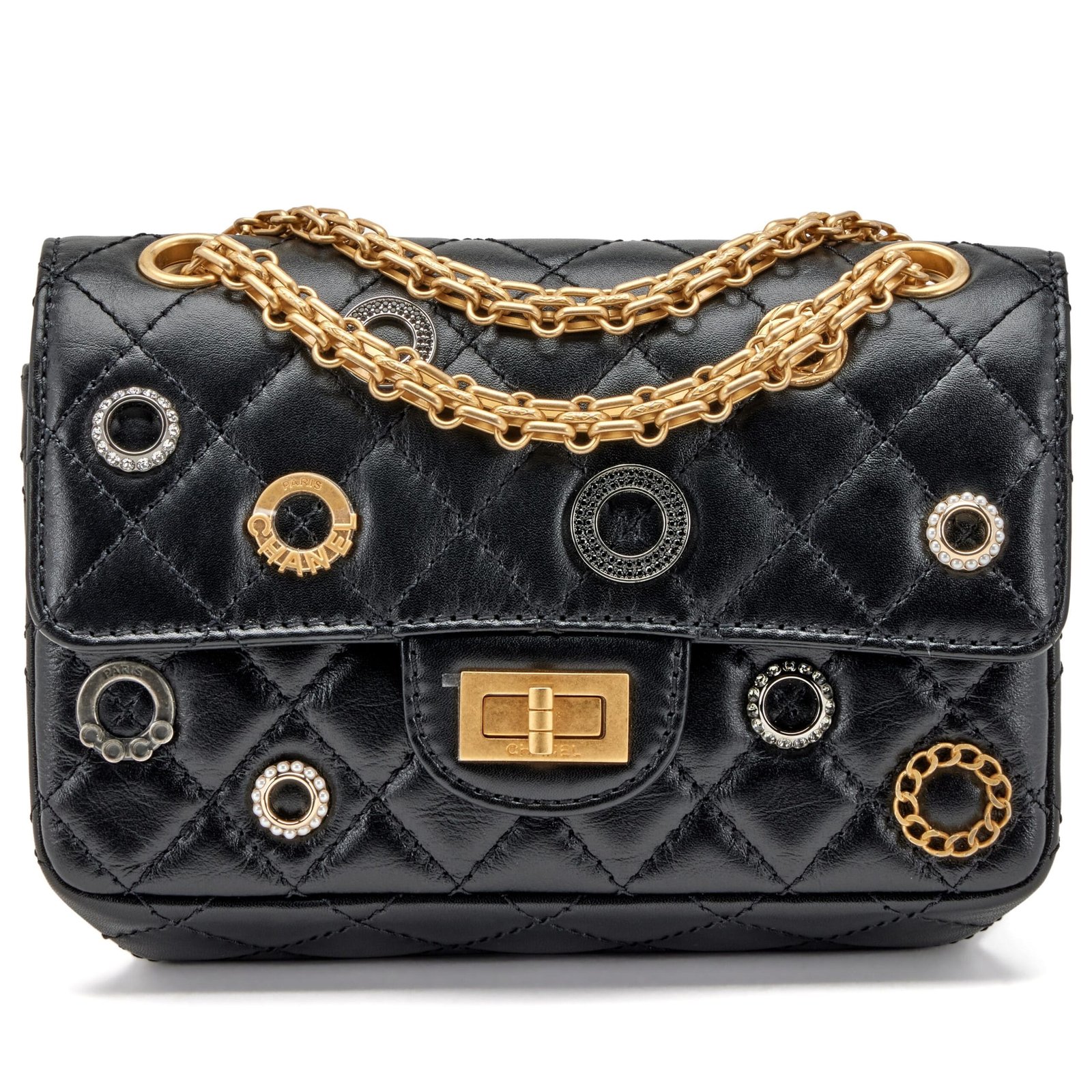 Black Aged Quilted Calfskin Crystal Charms 2.55 Reissue 224 Flap Gold Hardware, 2022