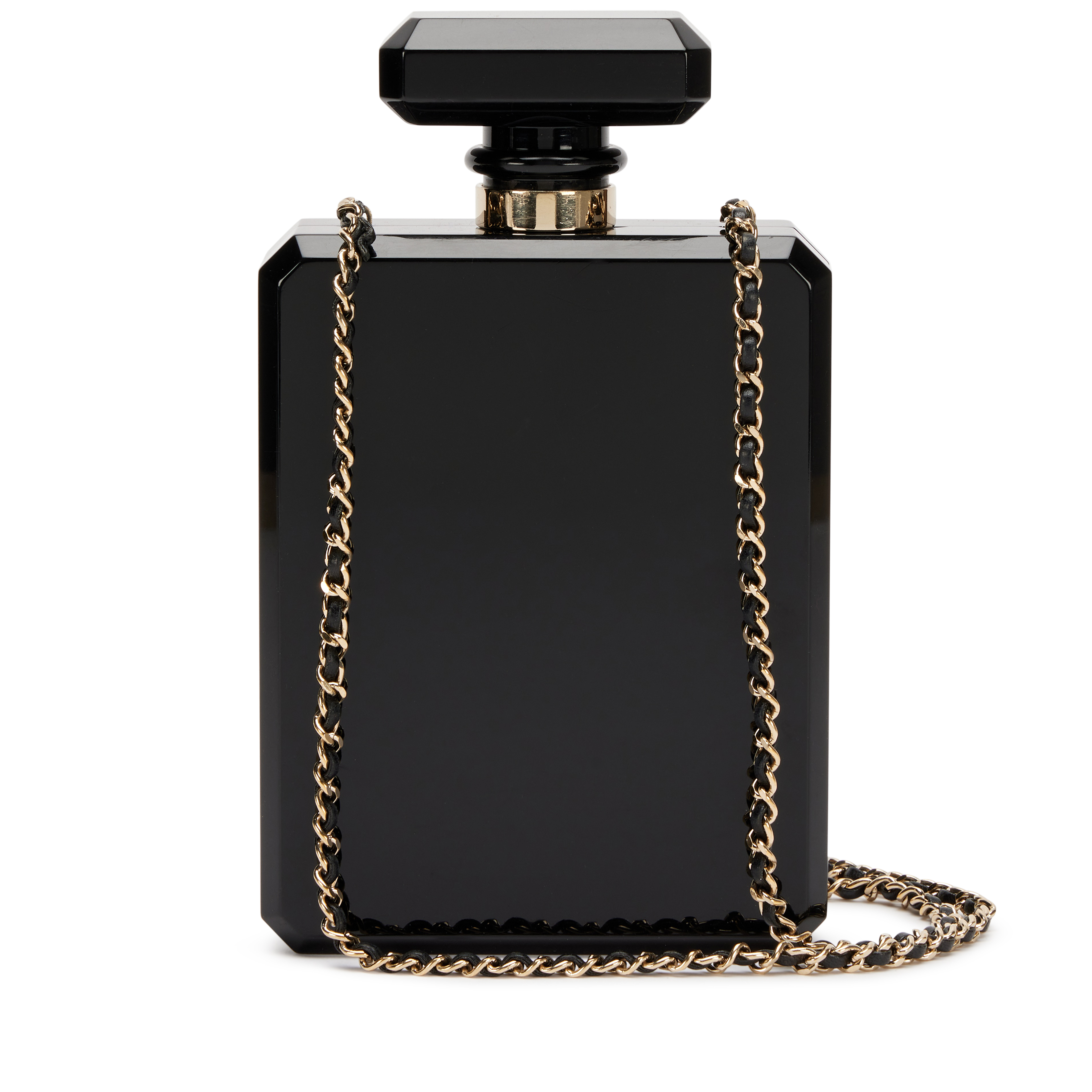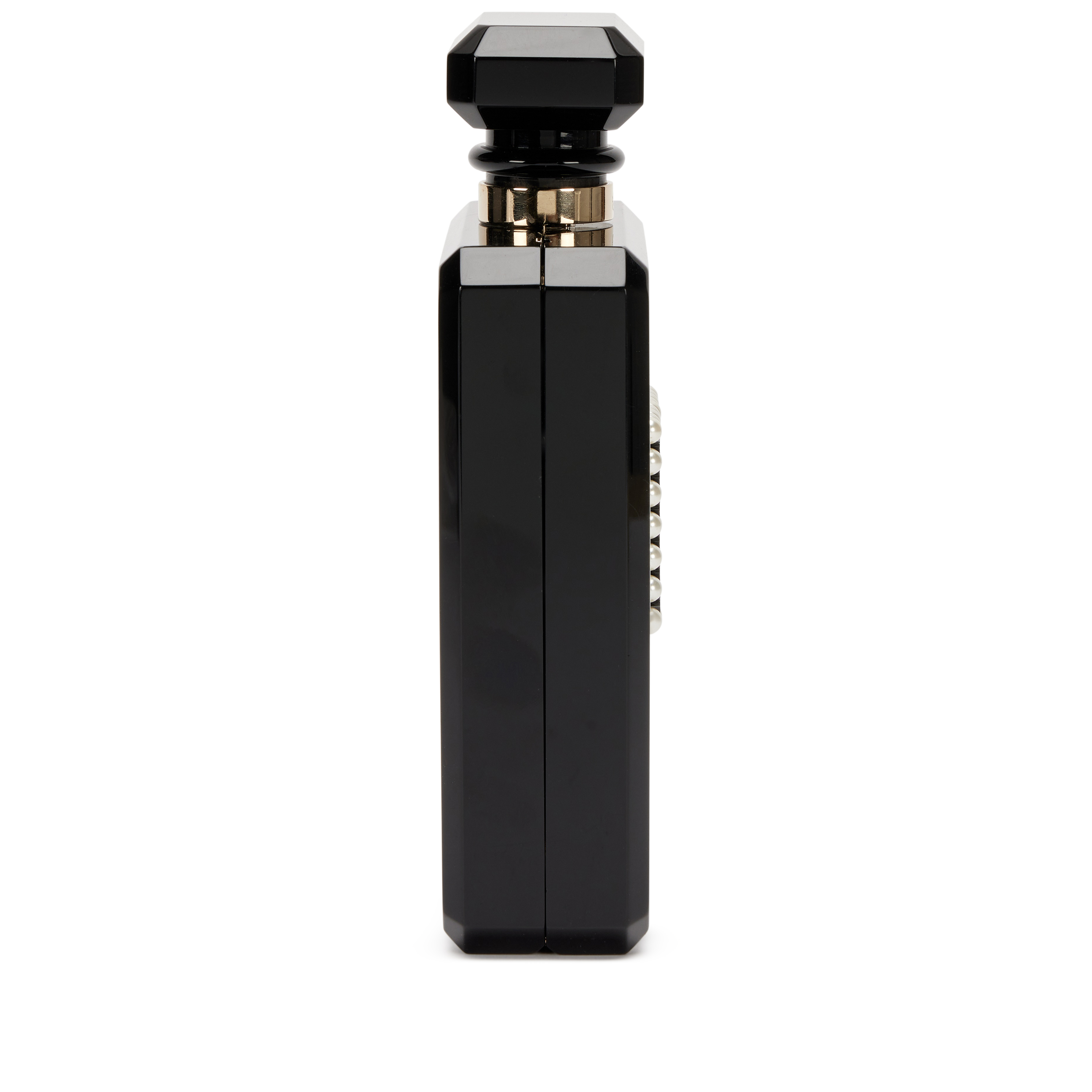 Black and Gold Glitter Plexiglass Faux Pearl Embellished Perfume Bottle Minaudière Gold Hardware, 2017