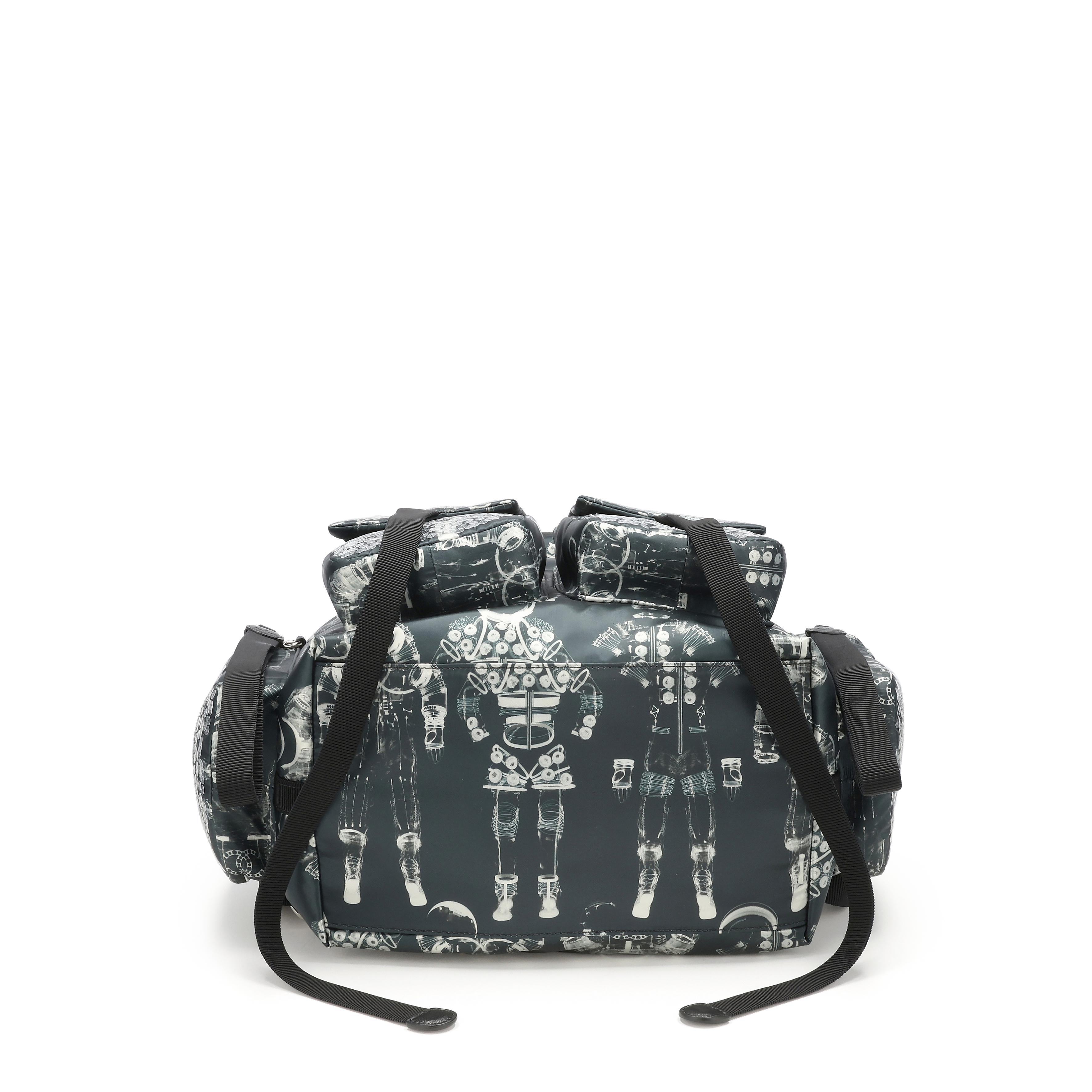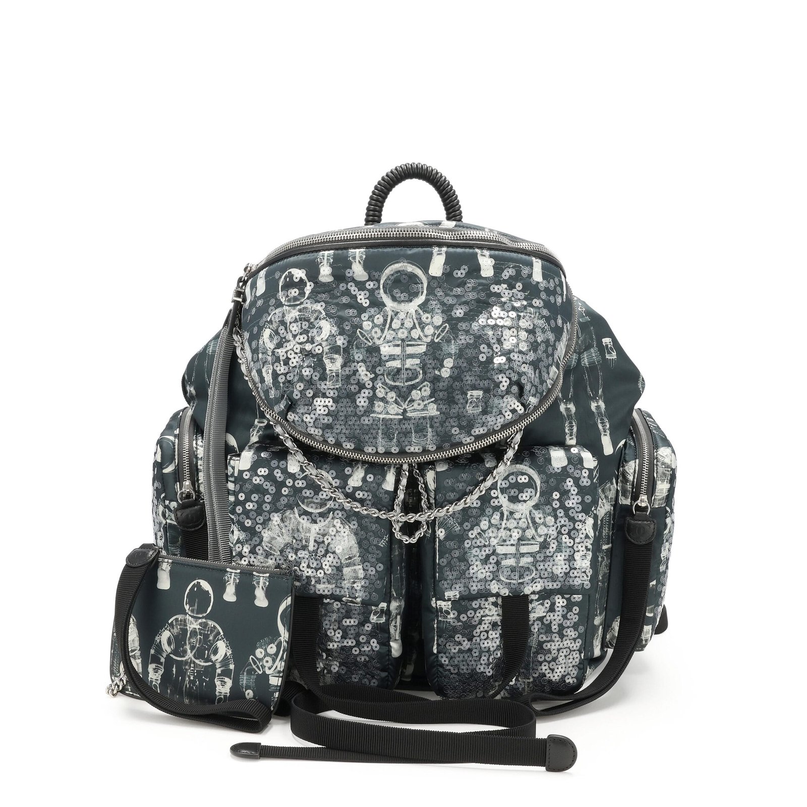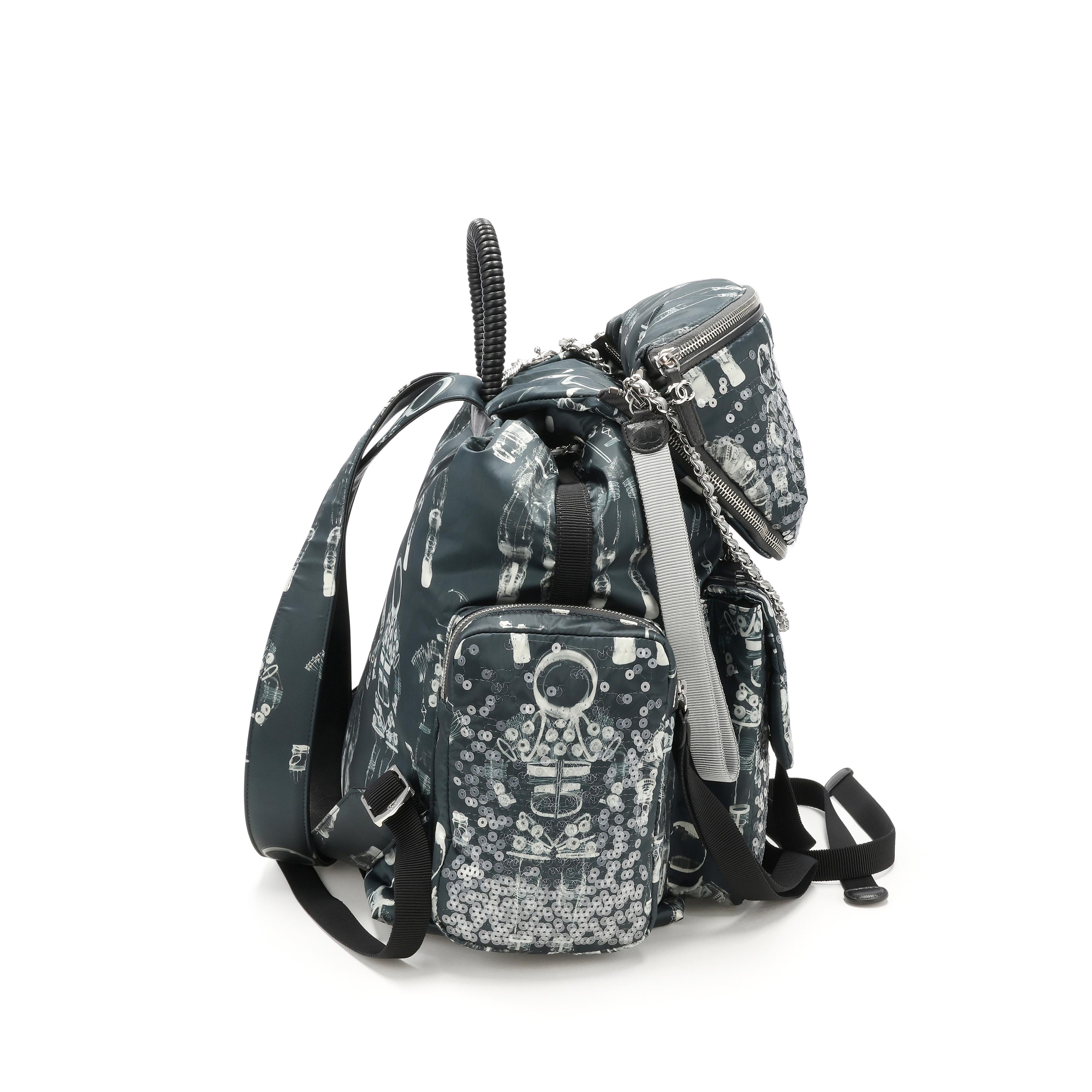 Chanel Black and Gray Printed Sequin Nylon Astronaut Essentials Backpack and Bum Bag Silver Hardware, 2017This piece was featured during the 2017 Fall/Winter Ready-to-Wear collectionThe interior is lined in a black textile materialIncludes removable bum bag, removable zip pouch, authenticity card, care booklet, dustbag and boxThis item is final sale and not eligible for return