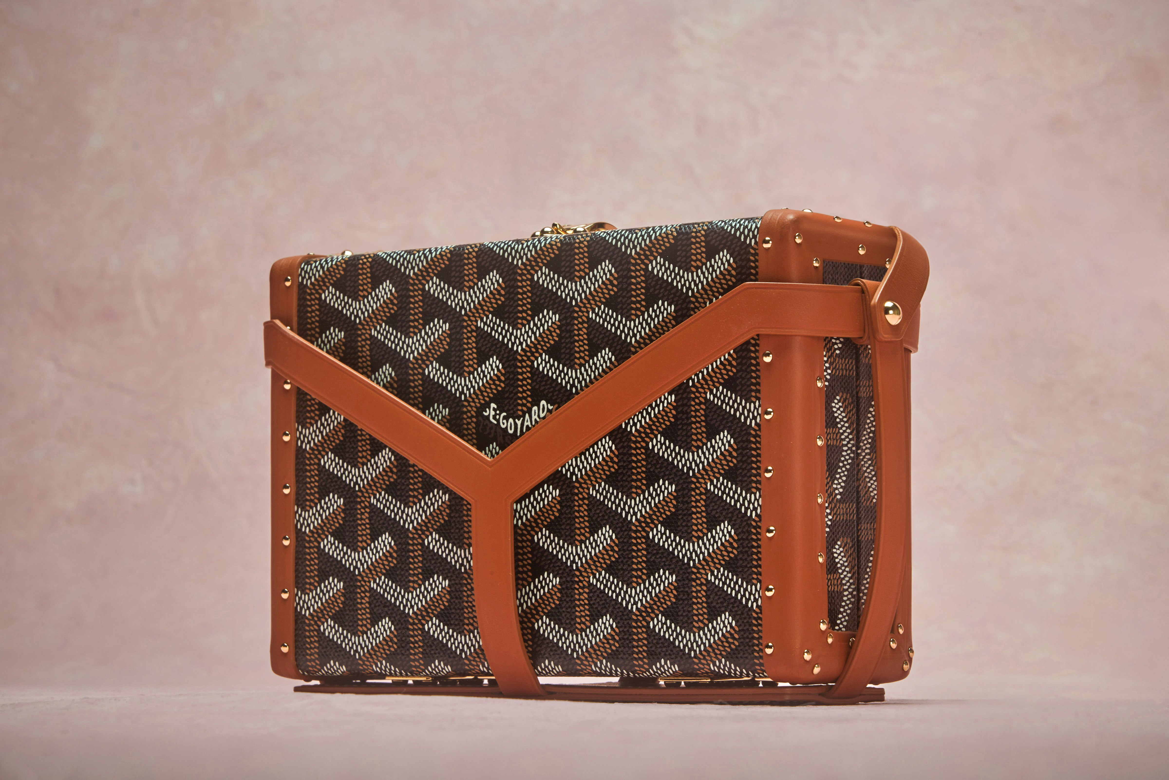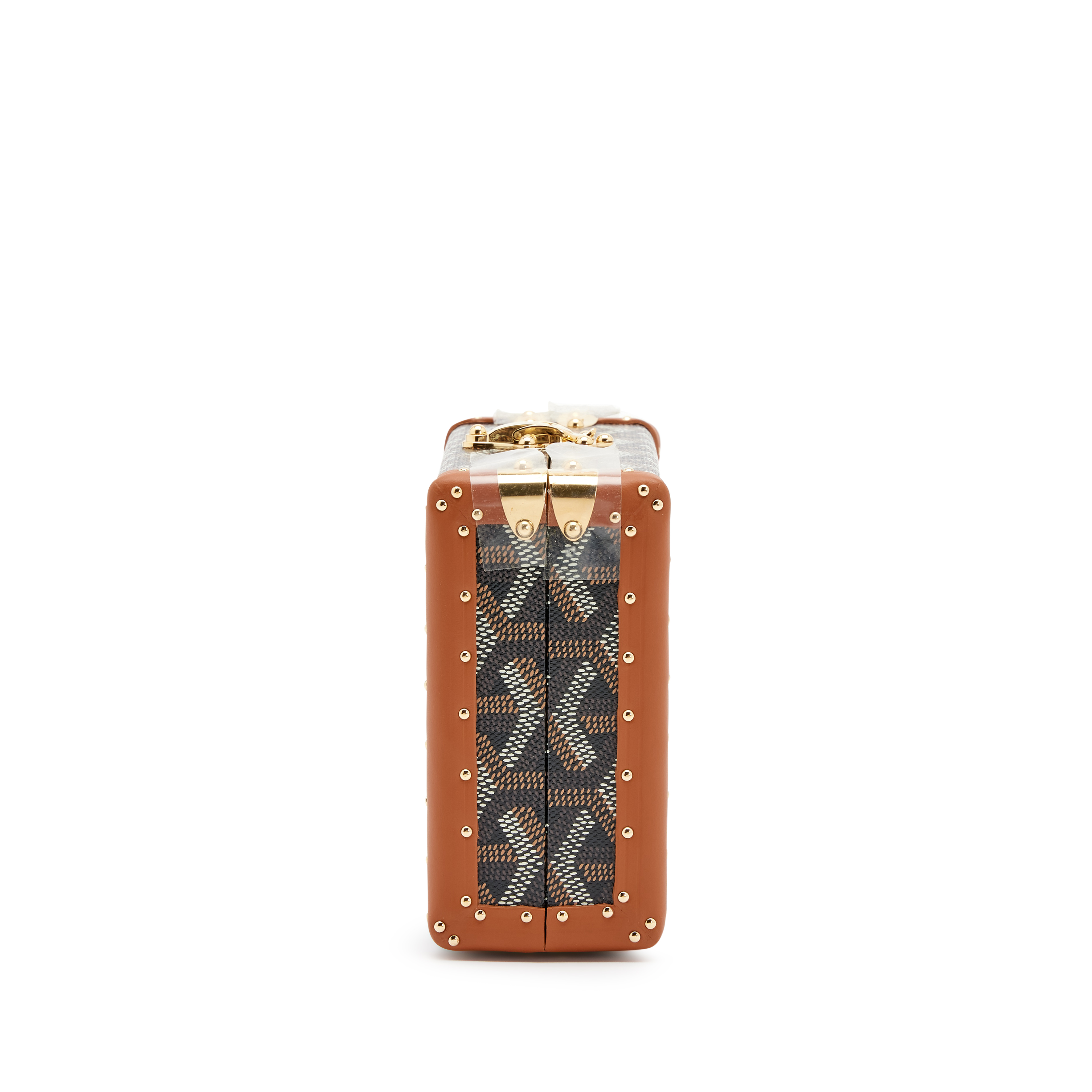 Goyard Black and Tan Goyardine Coated Canvas Minaudière Trunk Bag Gold Hardware, 2024The interior is lined in a yellow leatherIncludes shoulder strap, shoulder strap dust bag, ribbon, care booklet, dust bag, and boxThis item is final sale and not eligible for return