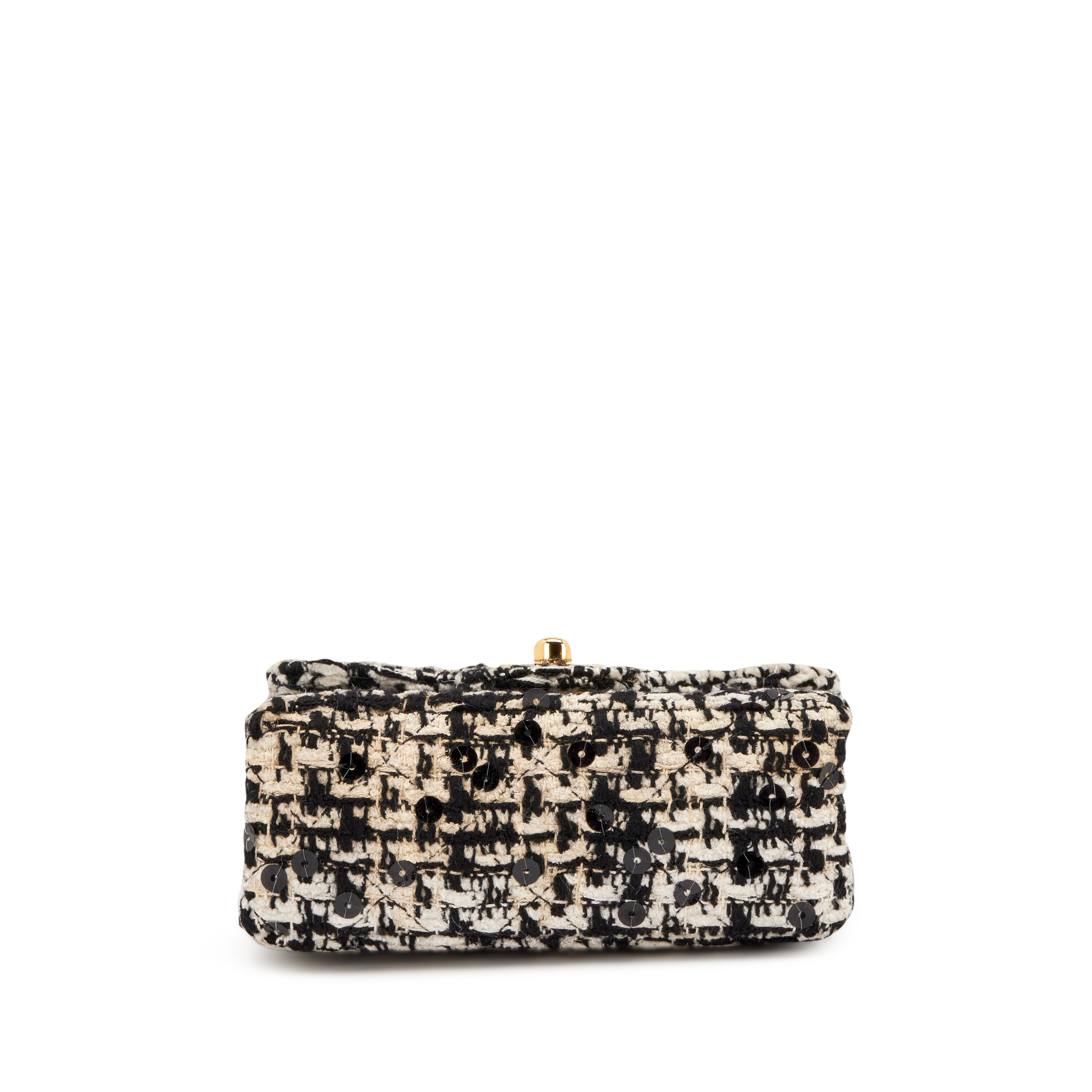 Chanel Black and White Tweed Mini Top Handle Flap Gold HardwareThe interior is lined in a black leatherIncludes care booklet, ribbon, dust bag, and boxThis item is final sale and not eligible for return