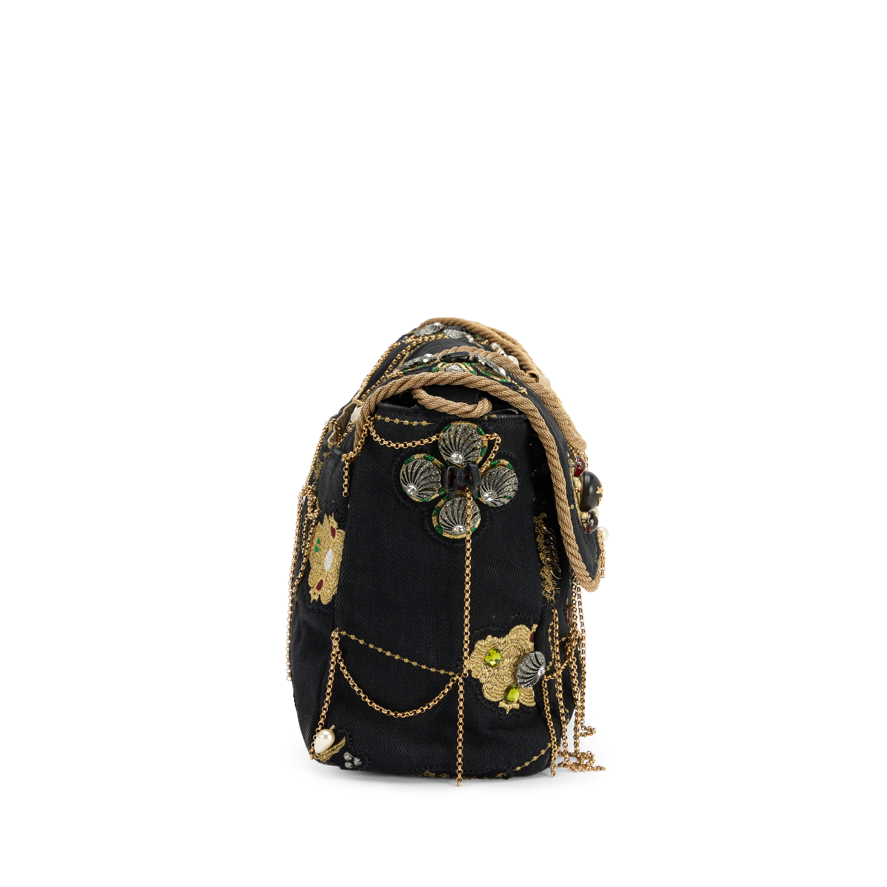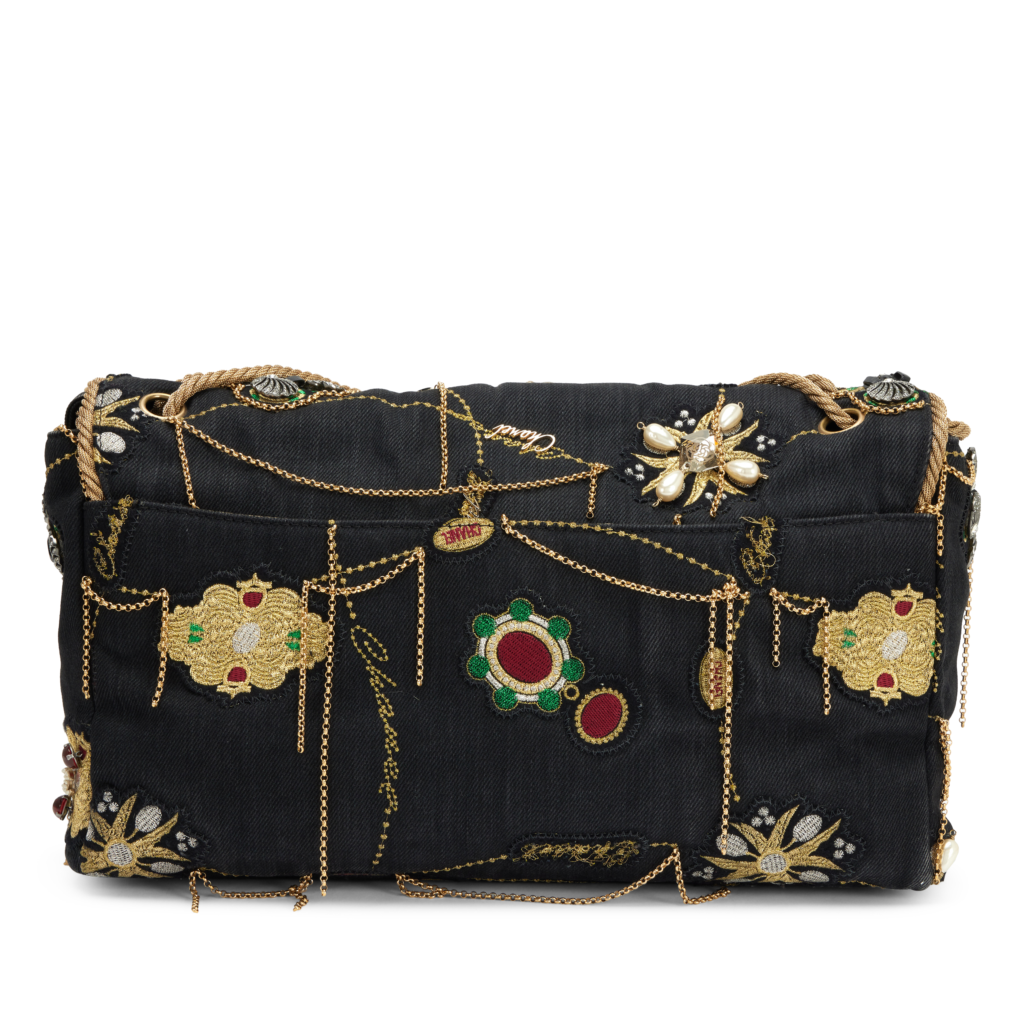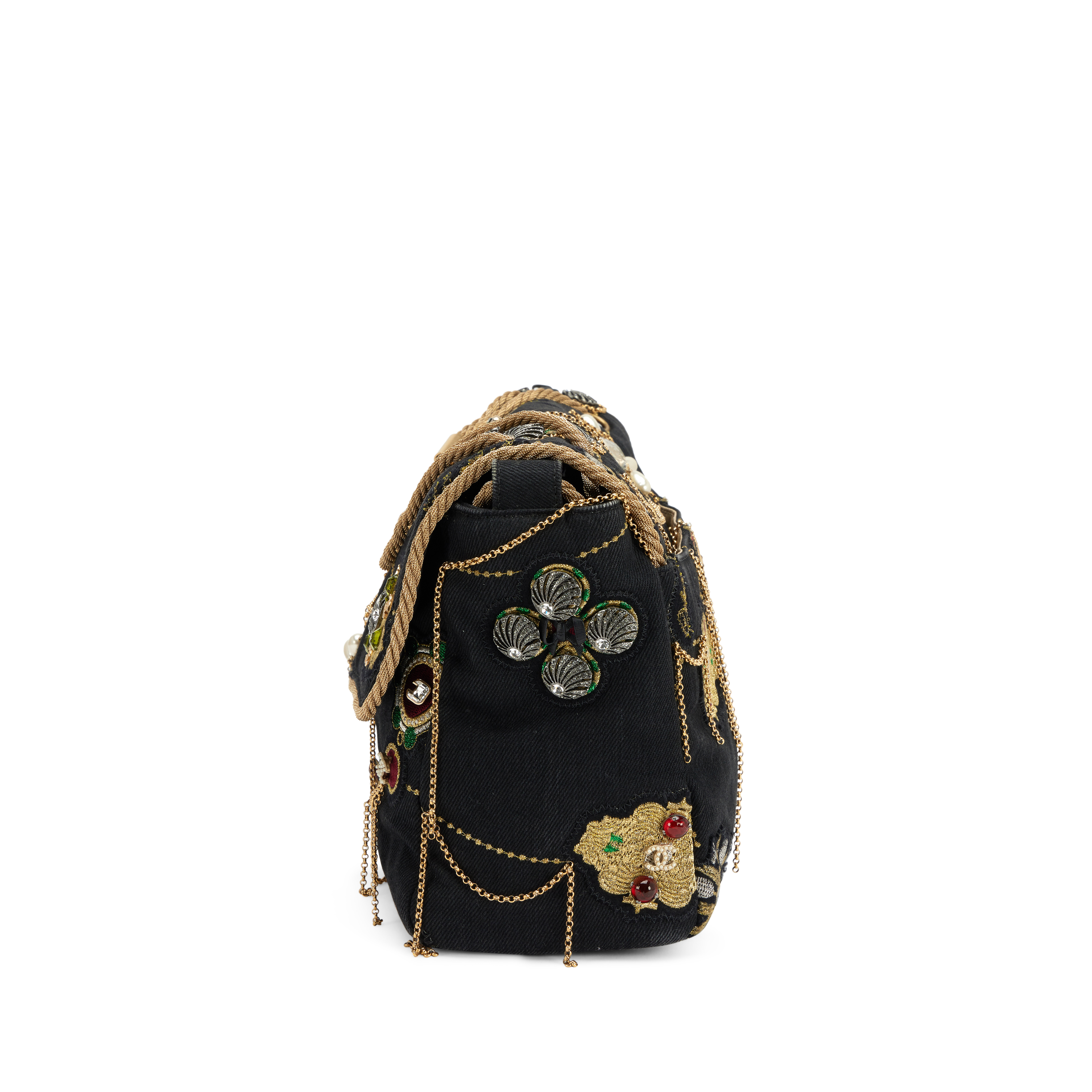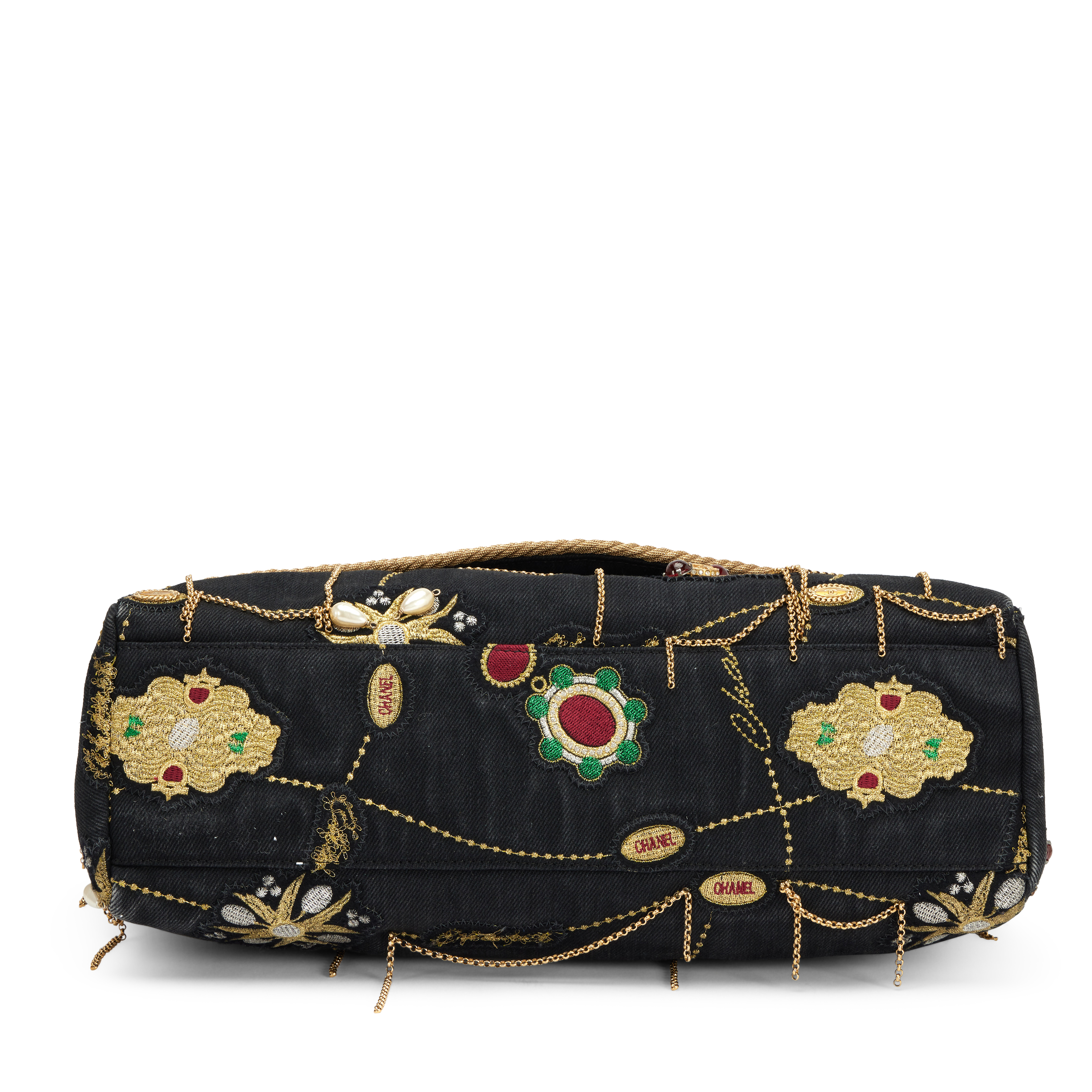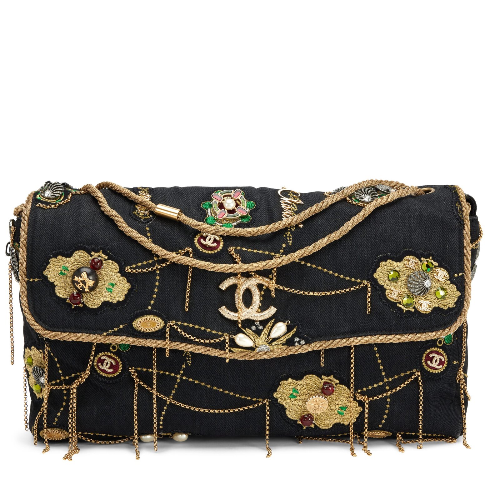 Chanel Black Denim Embellished Runway Prototype Jumbo Single Flap Bag Gold Hardware, 2008-2009The interior is lined in beige satinThis item is final sale and not eligible for return