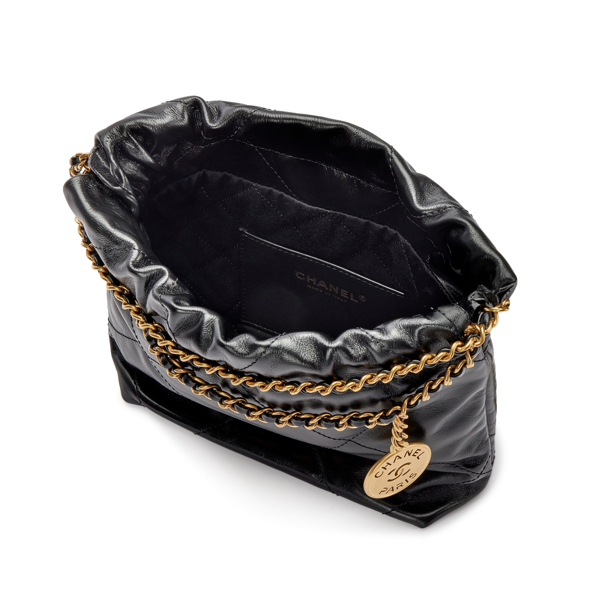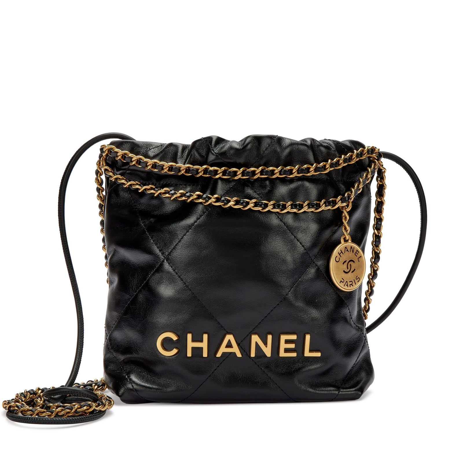 Chanel Black Quilted Calfskin Mini 22 Bag Brushed Gold HardwareThe interior is lined with tonal textile materialIncludes care booklet, dust bag and boxThis item is final sale and not eligible for return