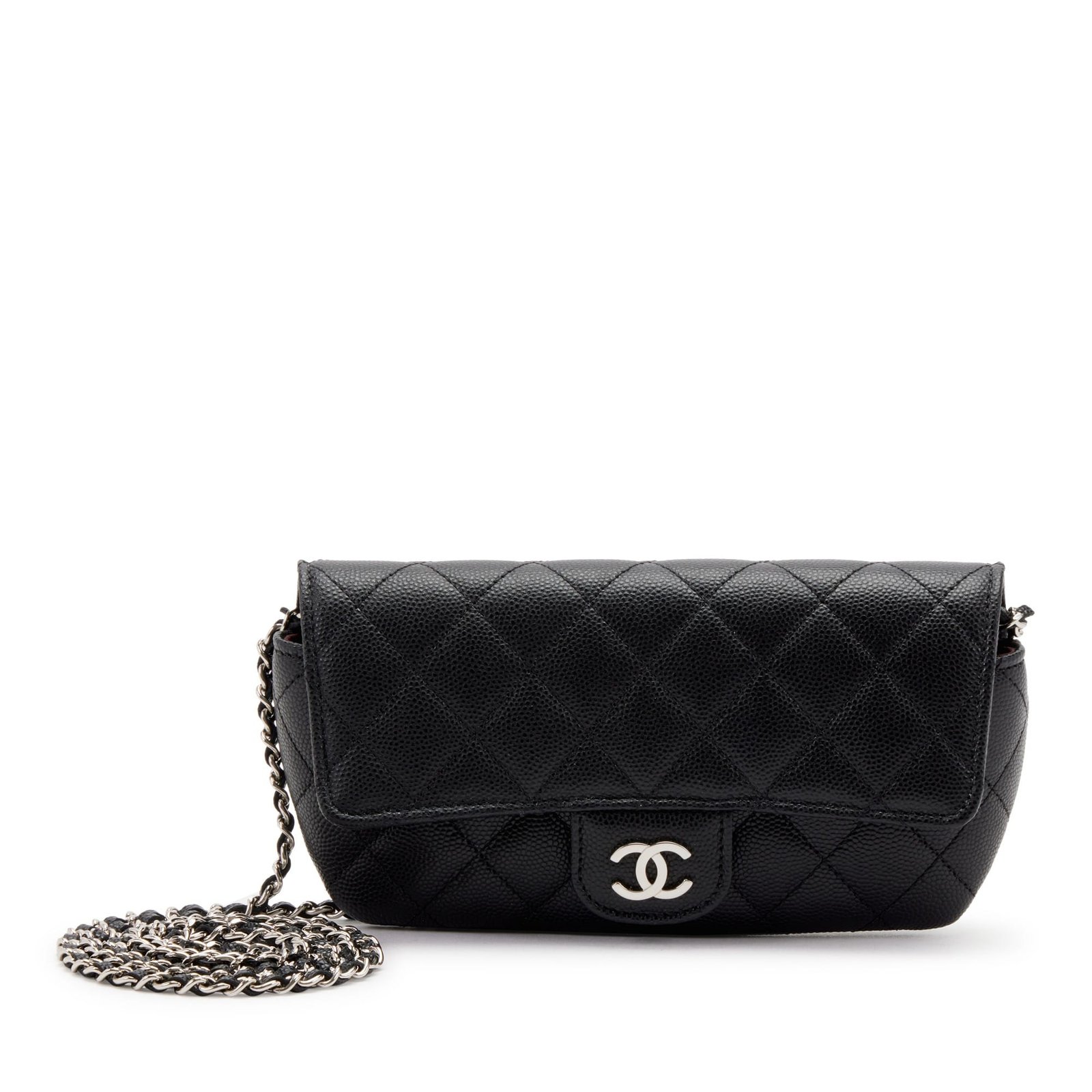 Chanel Black Quilted Caviar Glasses Case on Chain Silver Hardware, 2021This bag is lined with burgundy textile materialThis piece was featured during the 2021 Fall runway collectionIncludes tags, authenticity card, care booklet, dustbag and boxThis item is final sale and not eligible for return