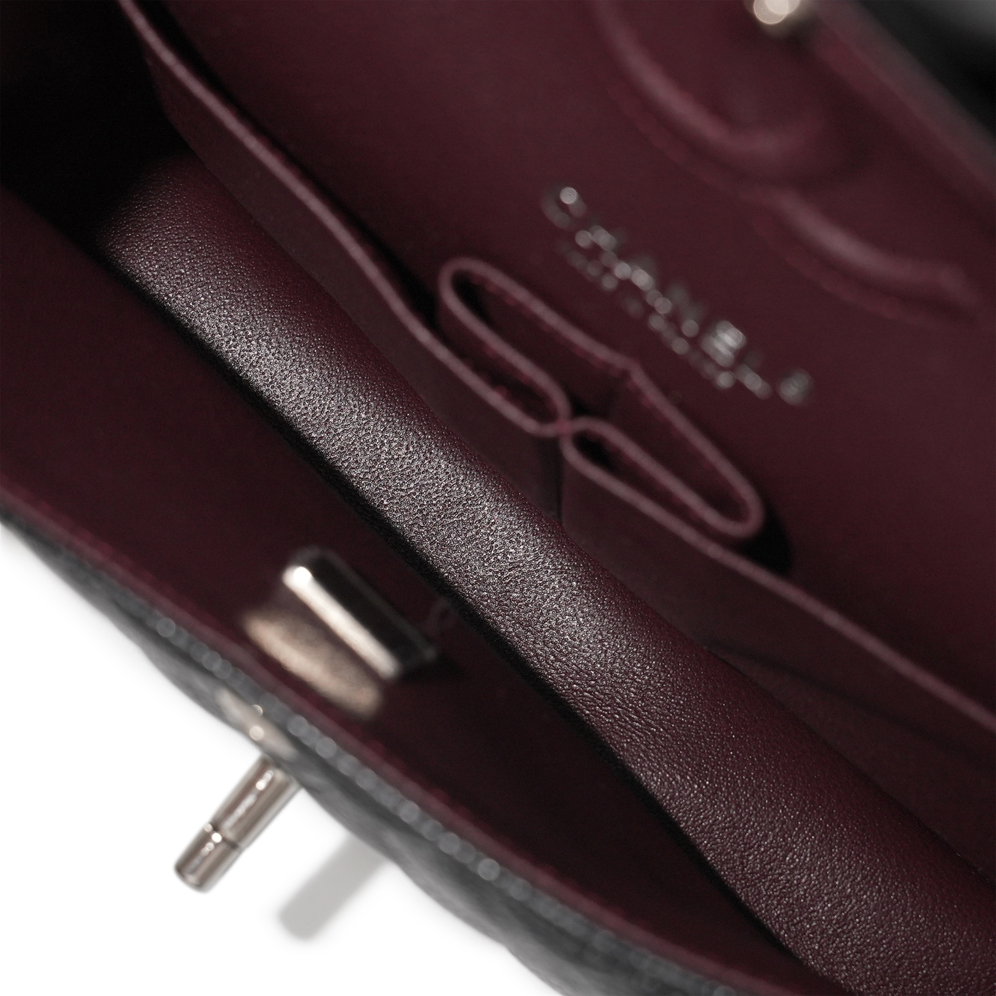 Chanel Black Quilted Caviar Small Timeless Classic Double Flap Bag Silver Hardware. The interior is lined with Burgundy leatherIncludes dust bag and box. This item is final sale and not eligible for return