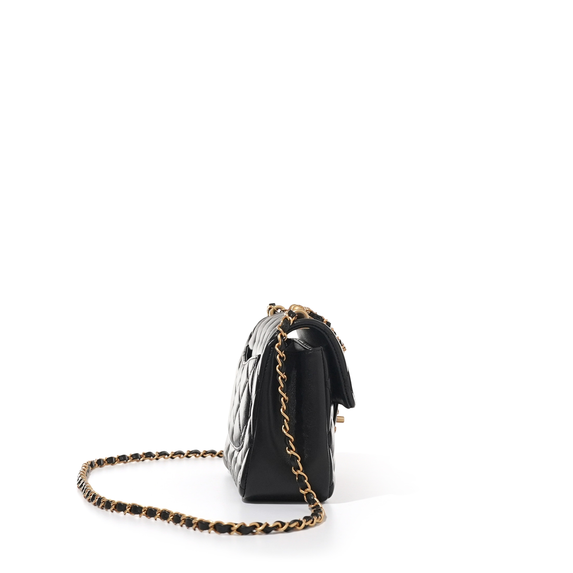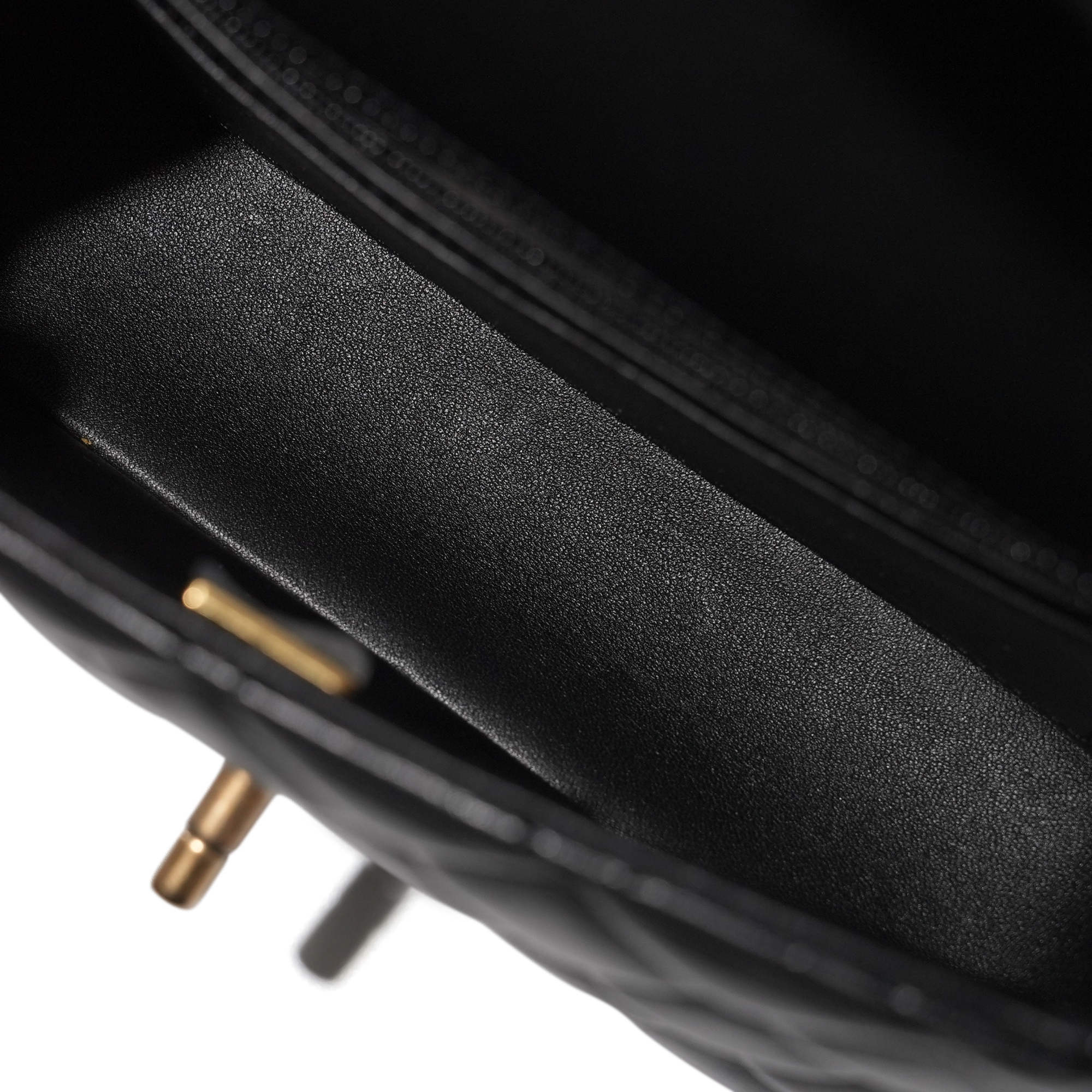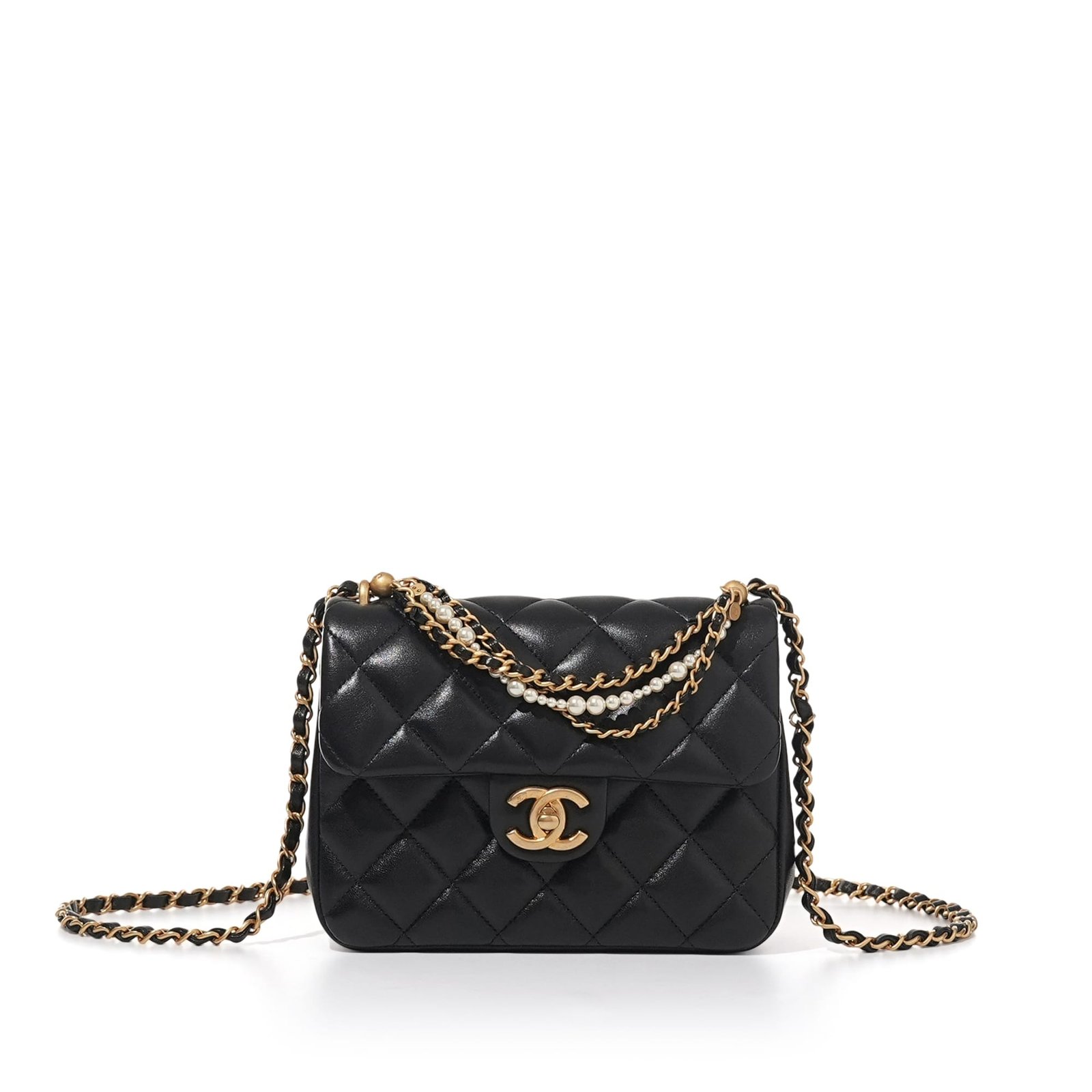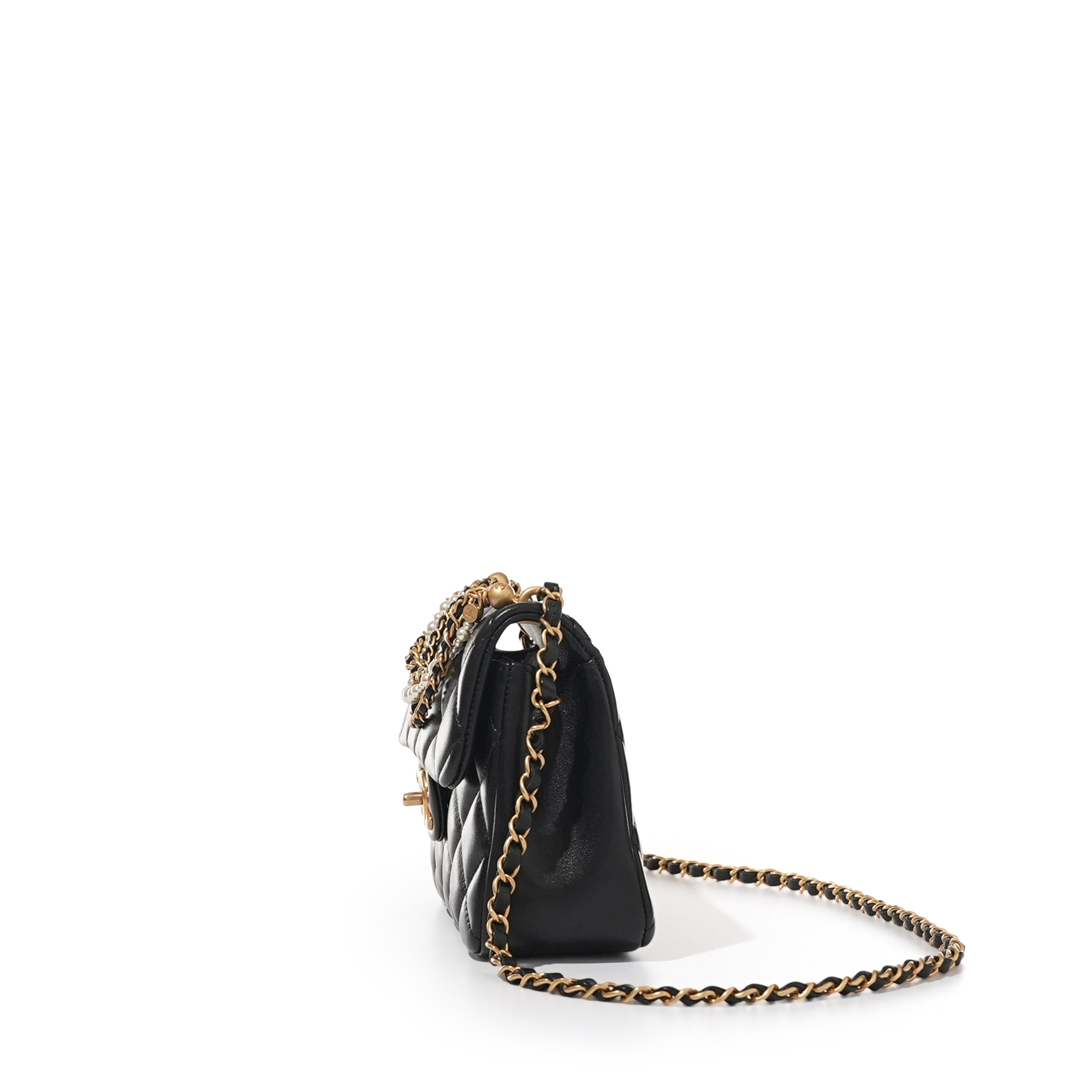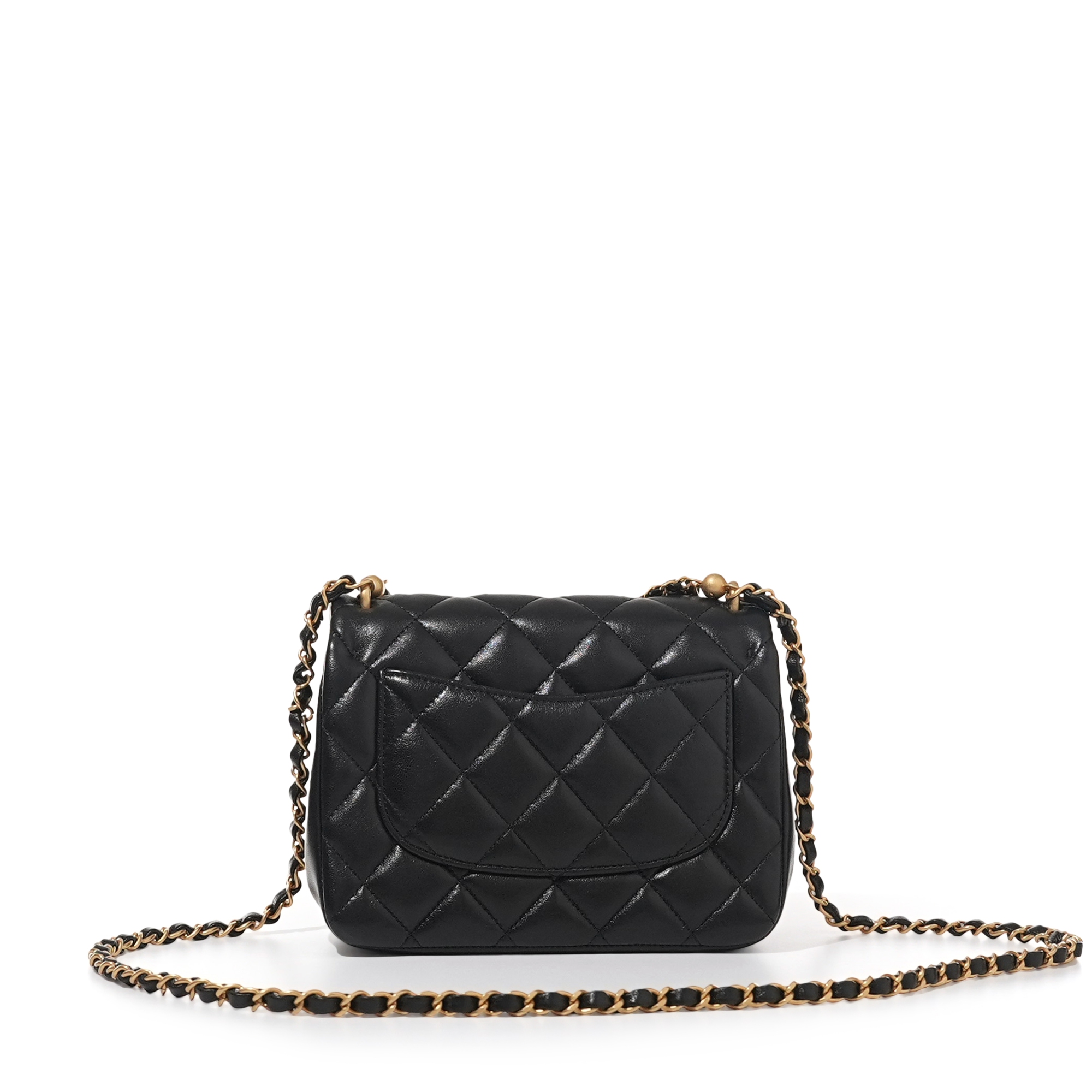 Chanel Black Quilted Lambskin and Imitation Pearl Top Handle Mini Flap Bag Brushed Gold Hardware, 2024. The interior is lined with tonal leatherIncludes dust bag and box. This item is final sale and not eligible for return