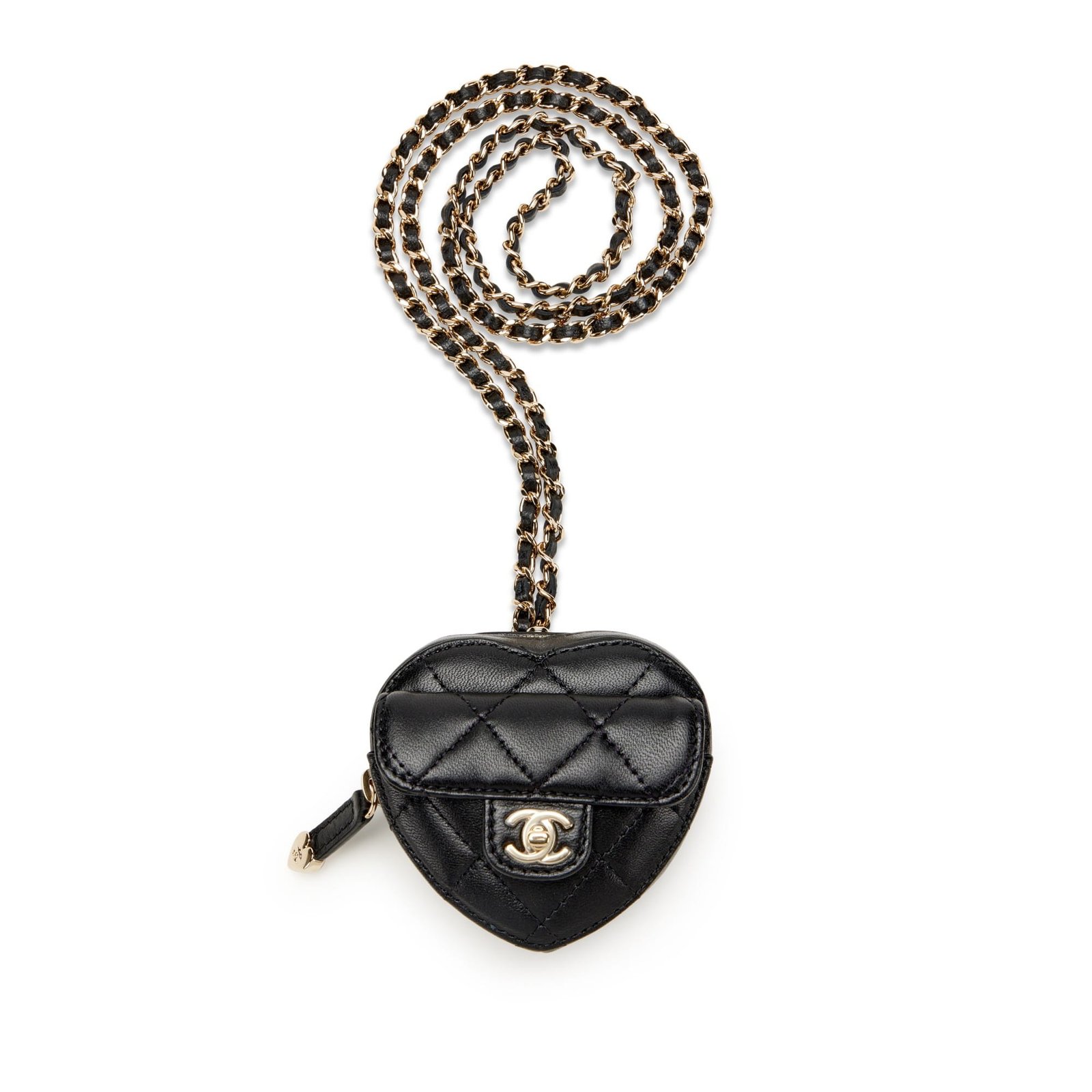 Black Quilted Lambskin Heart Zipped Coin Purse Necklace Gold Hardware, 2022