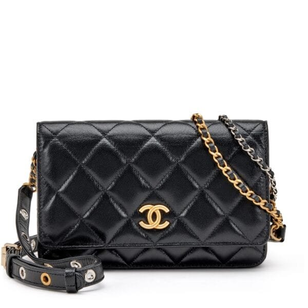 Black Quilted Lambskin Wallet On Chain WOC Brushed Gold and Silver Hardware