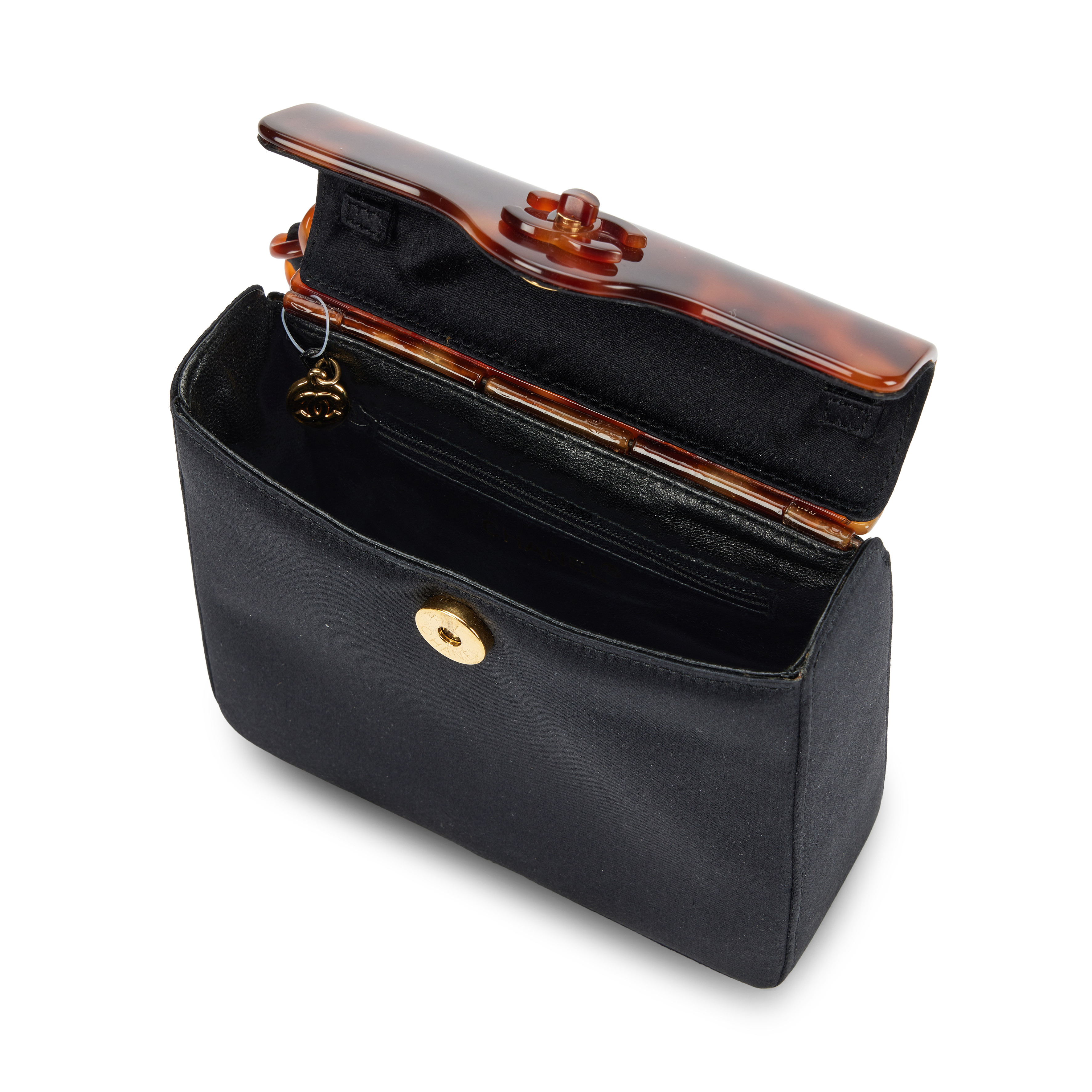 Chanel Black Satin CC Mini Flap Evening Bag Tortoiseshell Bakelite Hardware, 1999The interior is lined in a tonal leatherIncludes authenticity card, tag, dust bag, and boxThis item is final sale and not eligible for return