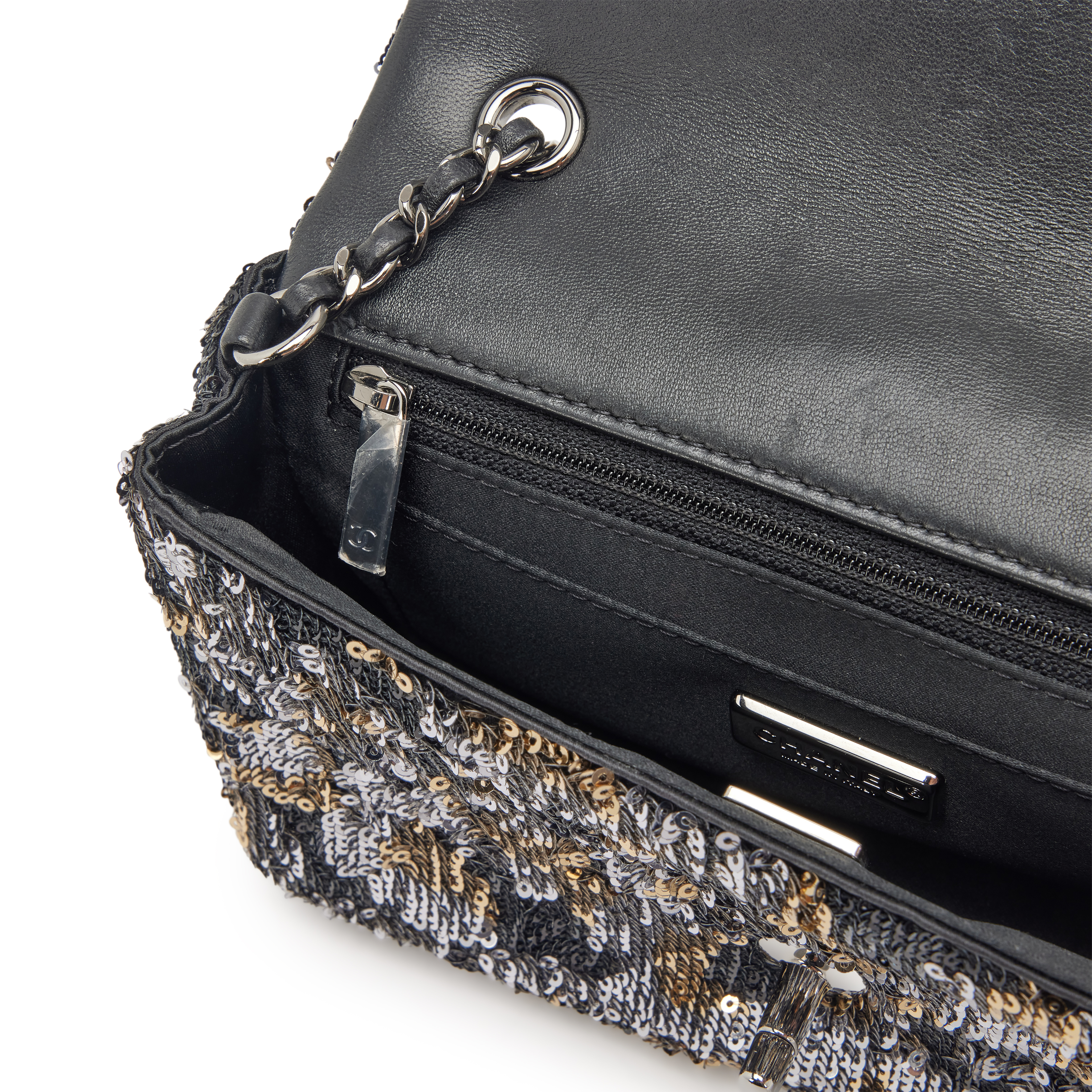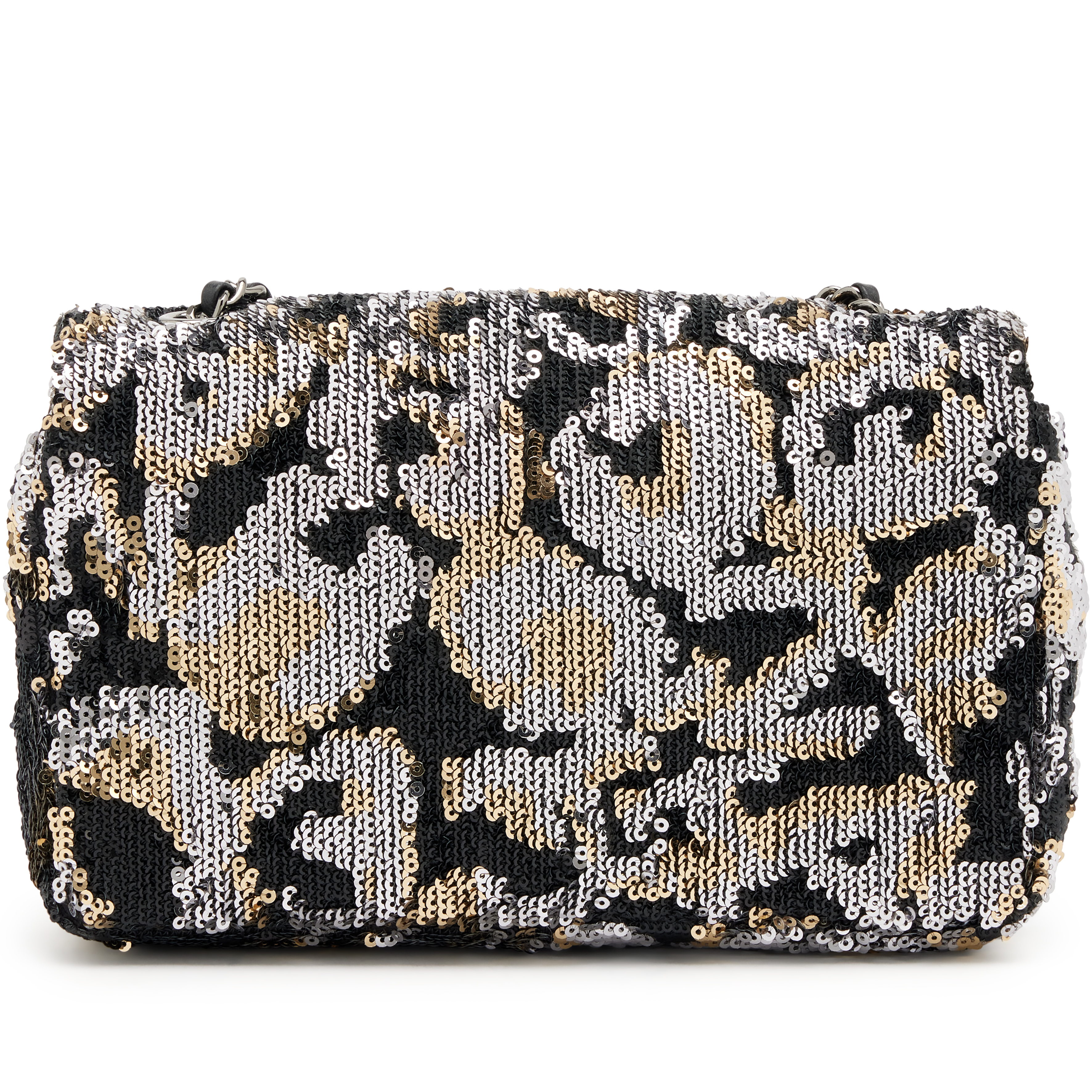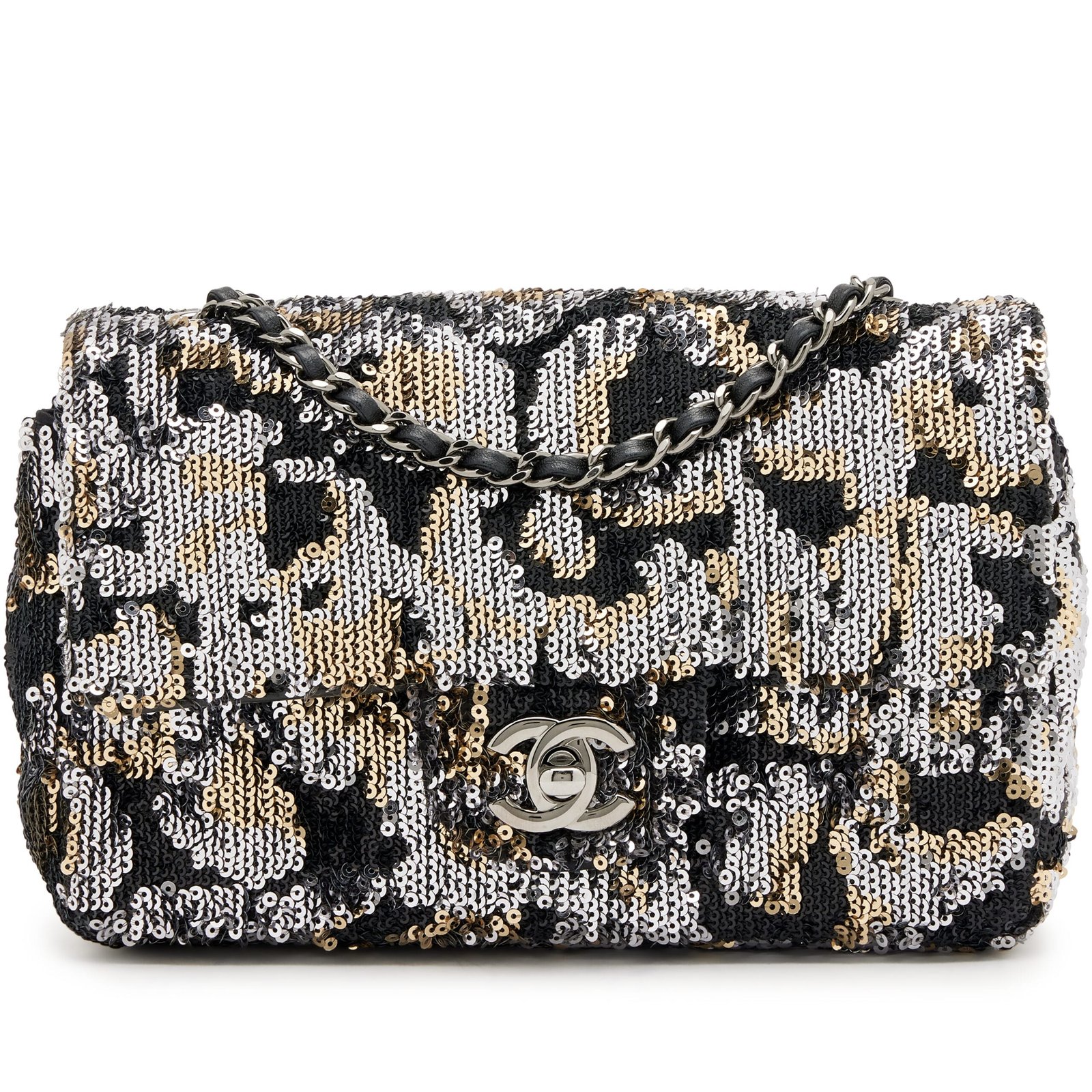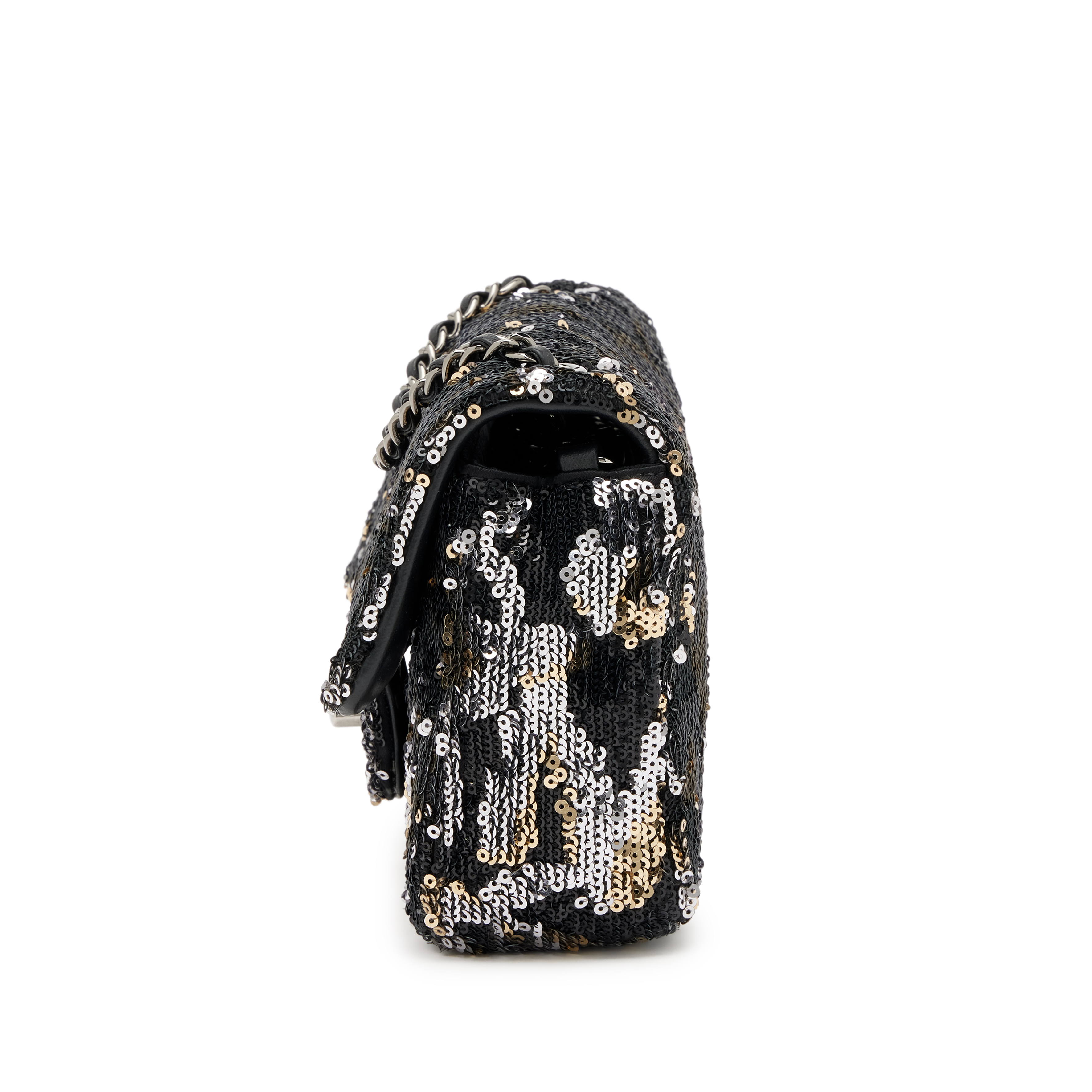 Chanel Black, Silver and Gold Sequin, and Black Lambskin Mini Rectangular Classic Single Flap Bag Ruthenium Hardware, 2022