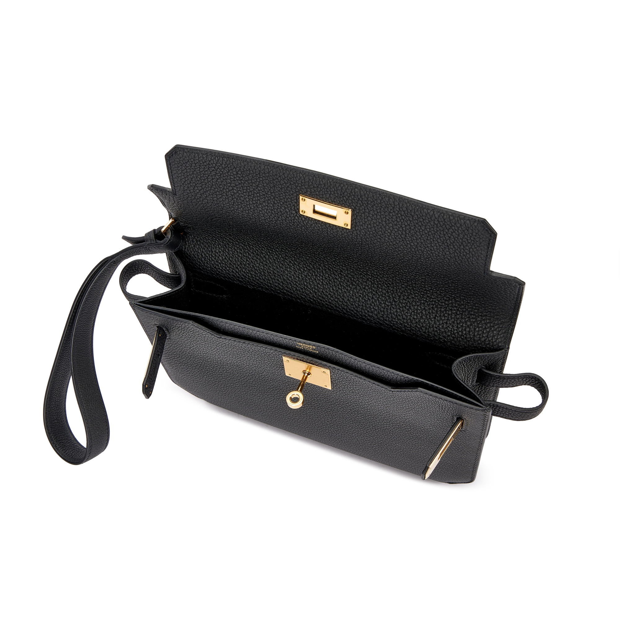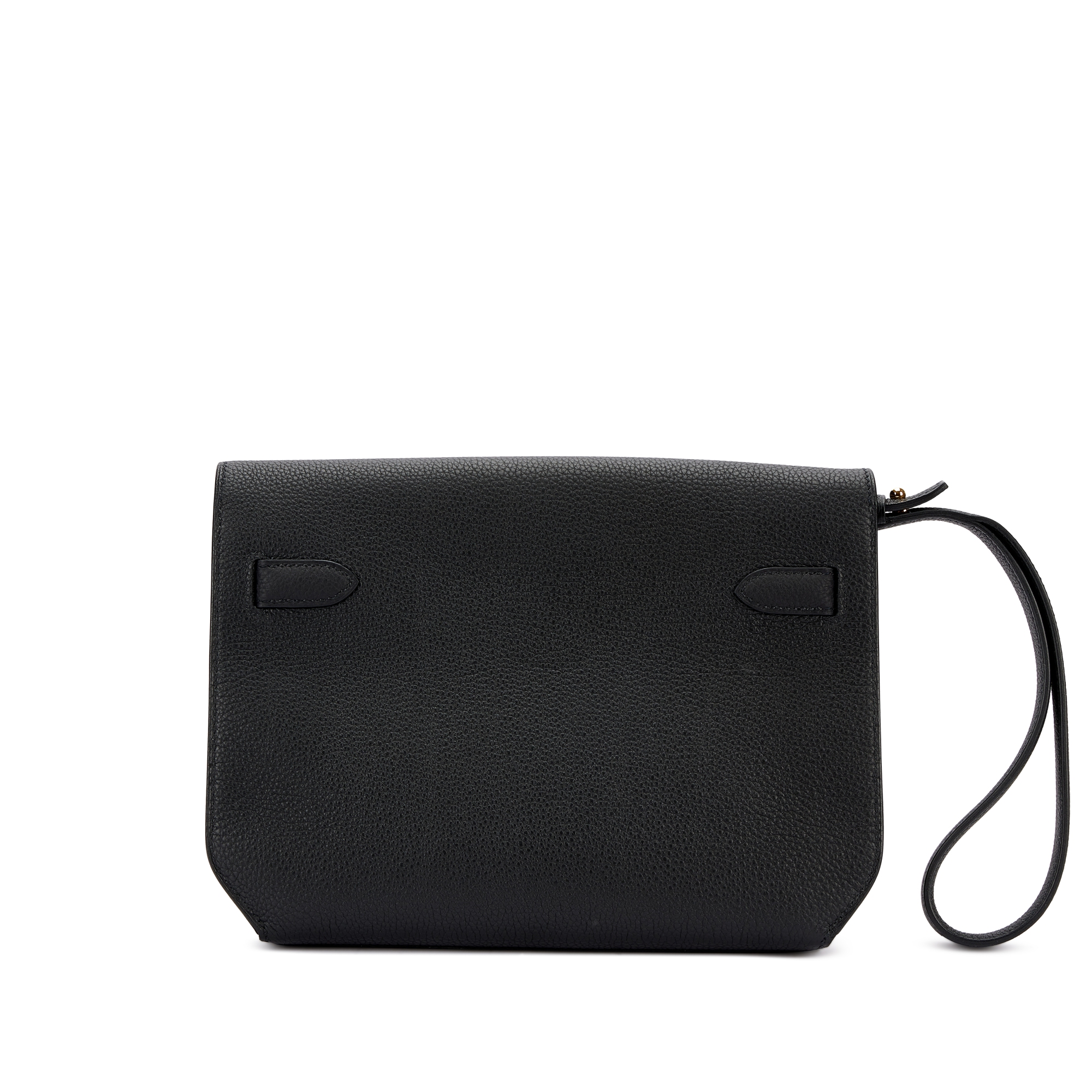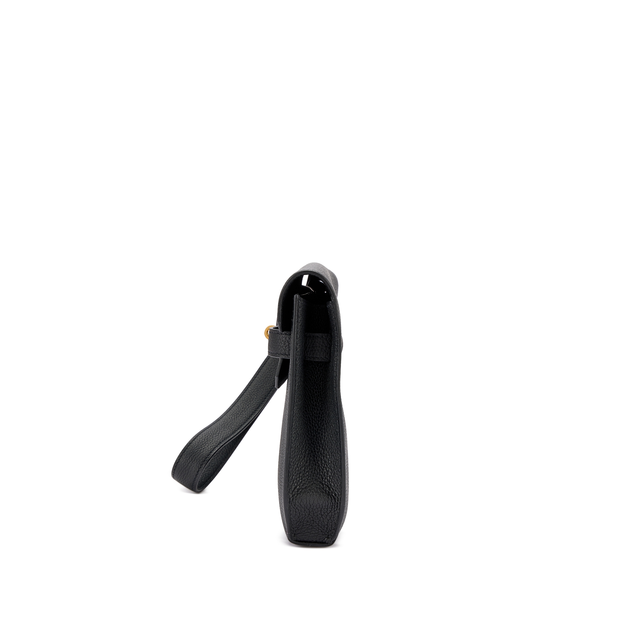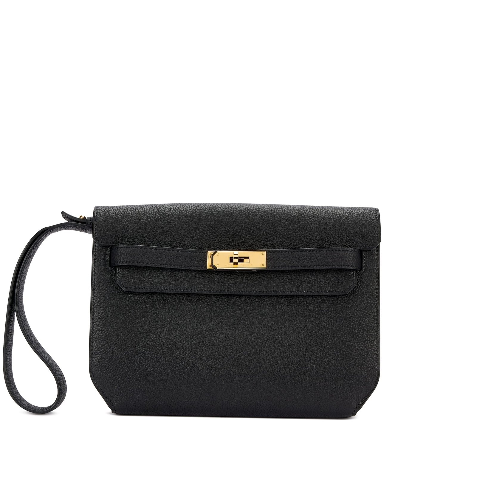 Hermès Black Togo Kelly Depeches 25 Gold Hardware, 2020. Kelly depeches 25 pouch. Pouch in Woolycot and Togo calfskin. Business cards pocket. Removable lanyard. Can be carried by hand or on the wrist. Made in France.