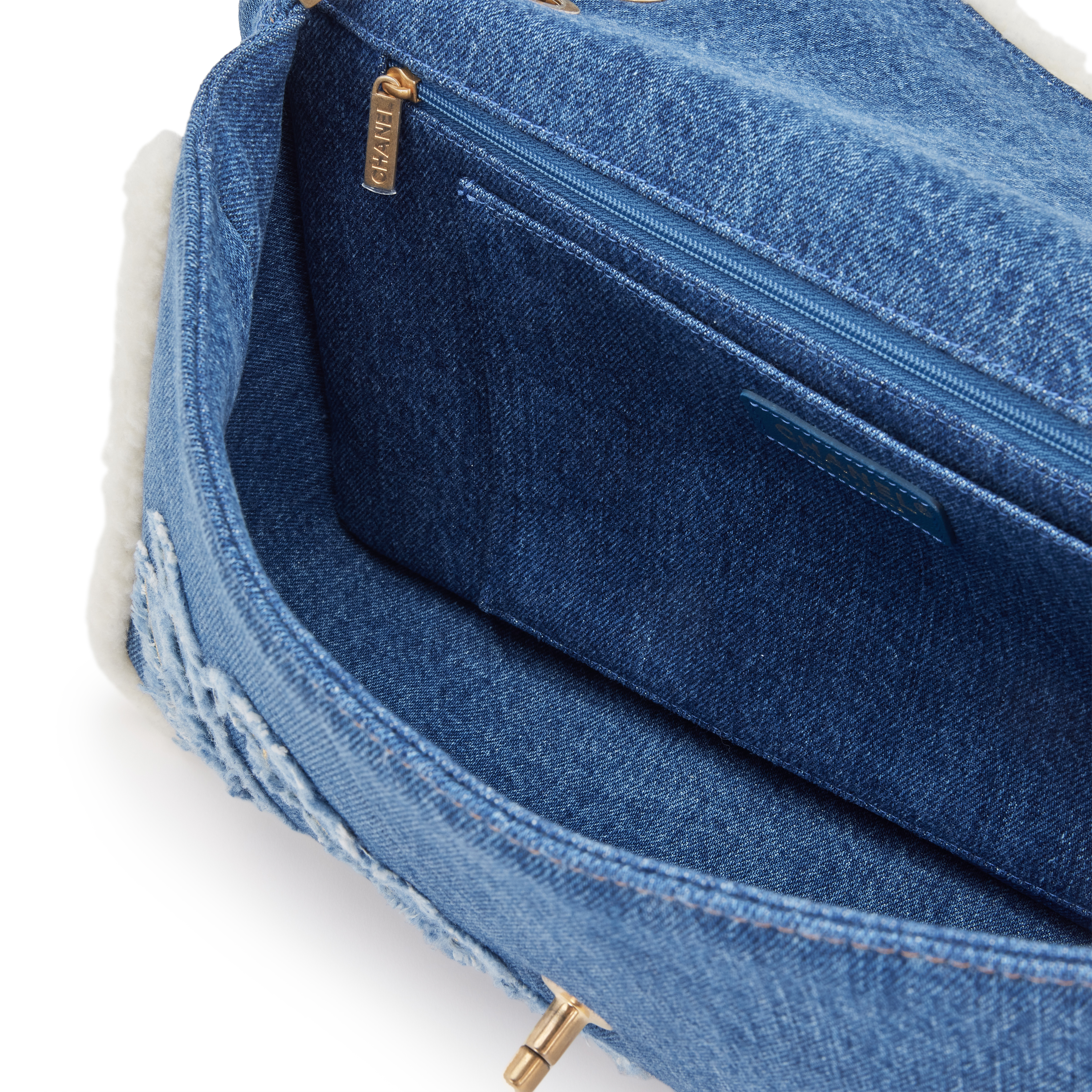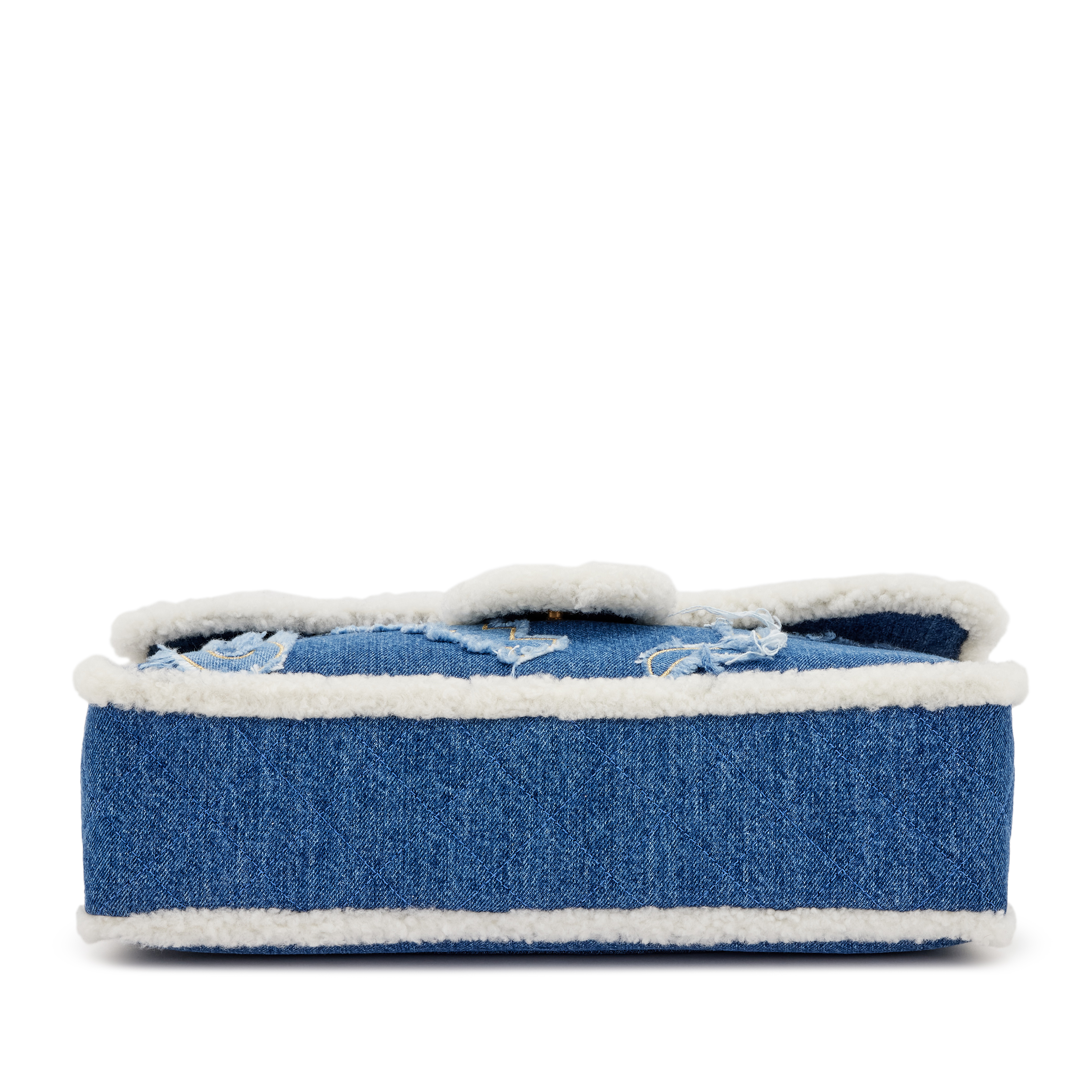 Blue Denim, White Shearling Paris-New York Hieroglyph Maxi Flap Bag Gold Hardware, 2019
