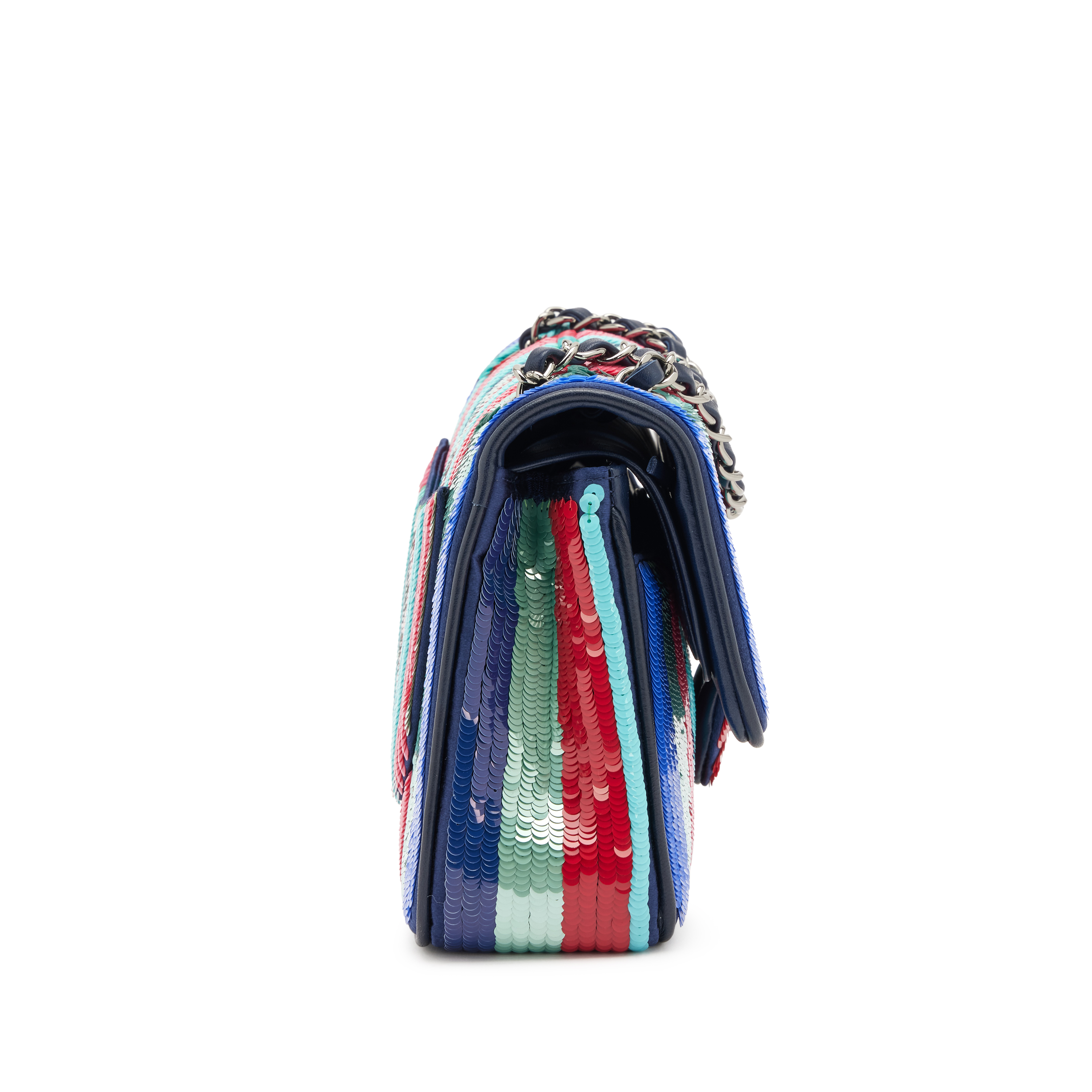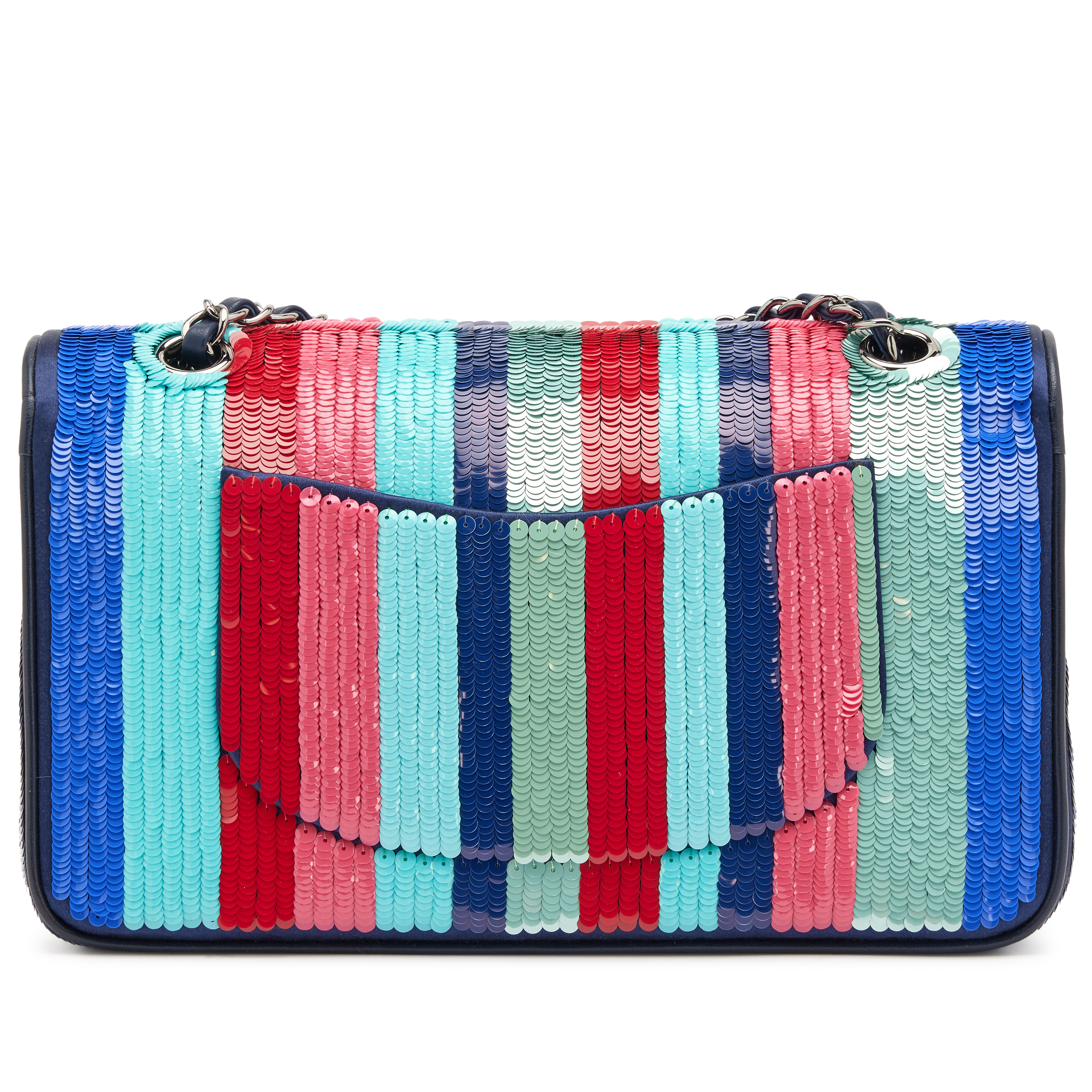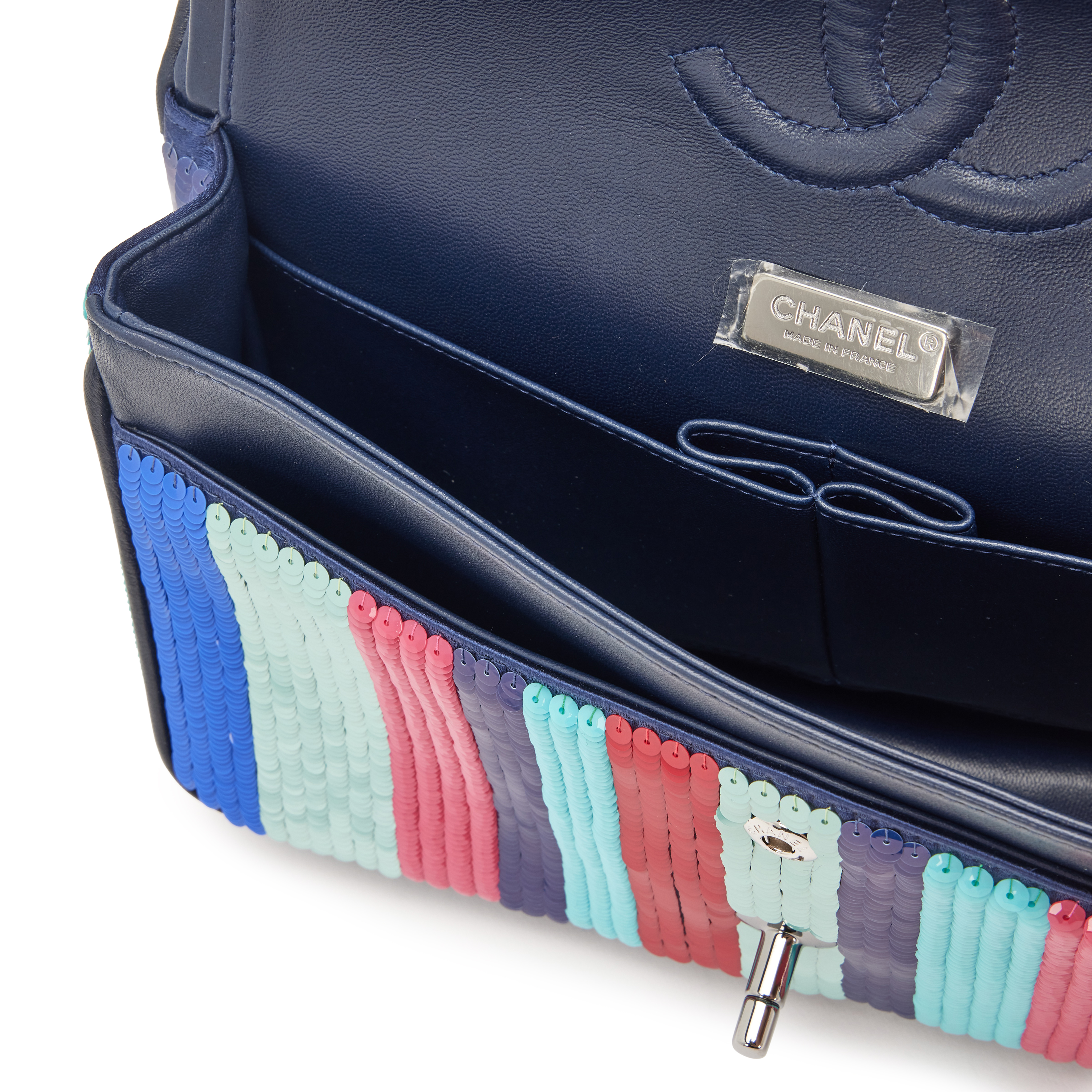 Chanel Blue, Green, Red, Navy, Pink, Rainbow Sequin and Navy Blue Lambskin Medium Classic Double Flap Bag Ruthenium Hardware, 2016