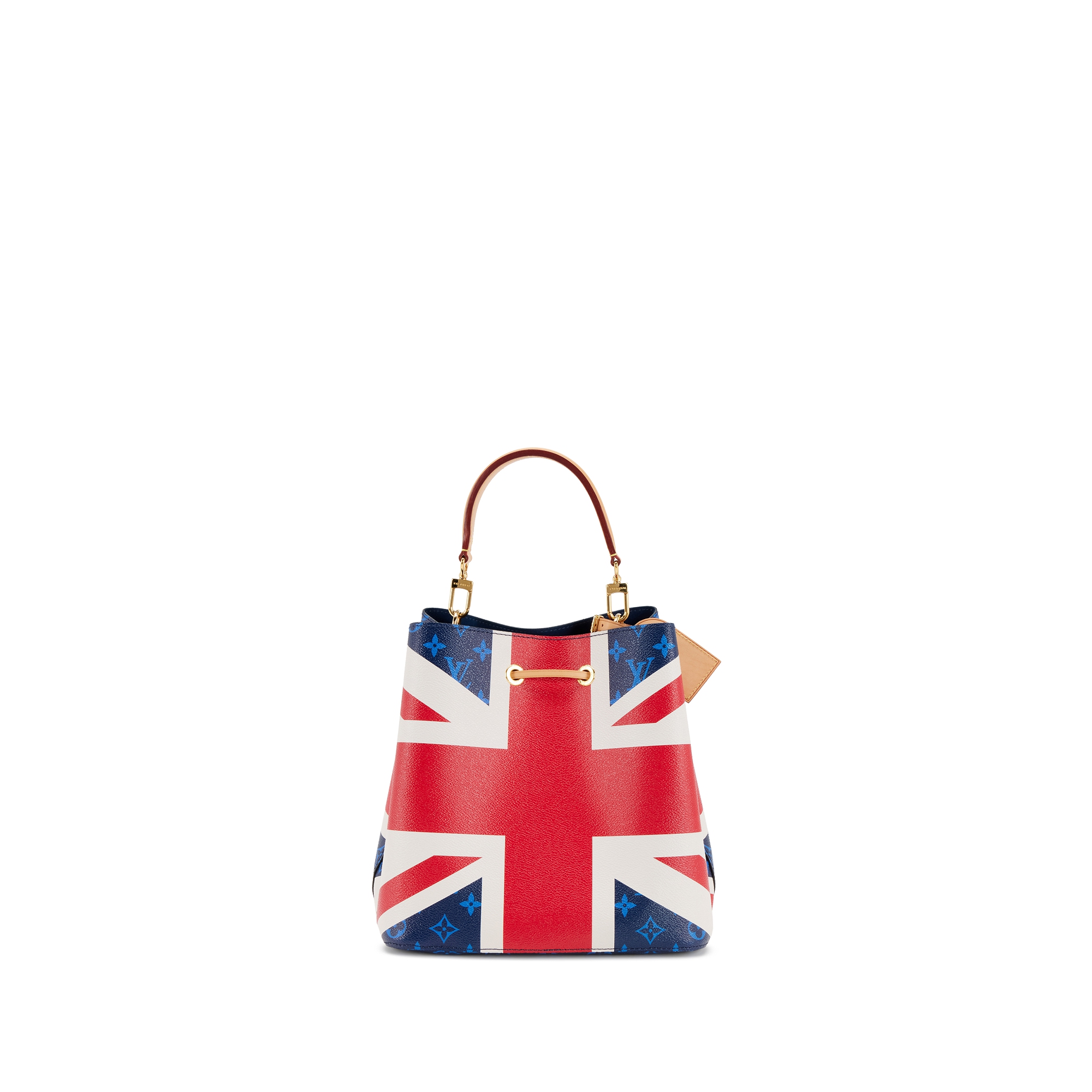 Louis Vuitton Blue Monogram, Red, and White Coated Canvas Royal Wedding Union Jack UK Flag Printed NeoNoe MM Bucket Bag Gold Hardware, 2018The interior is lined in a dark blue suedeIncludes shoulder strap, New Bond Street 2018 luggage tag, dust bag and box This item is final sale and not eligible for return