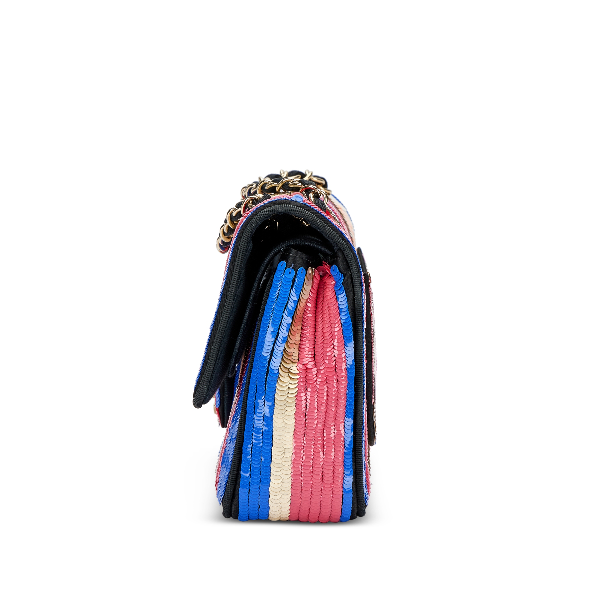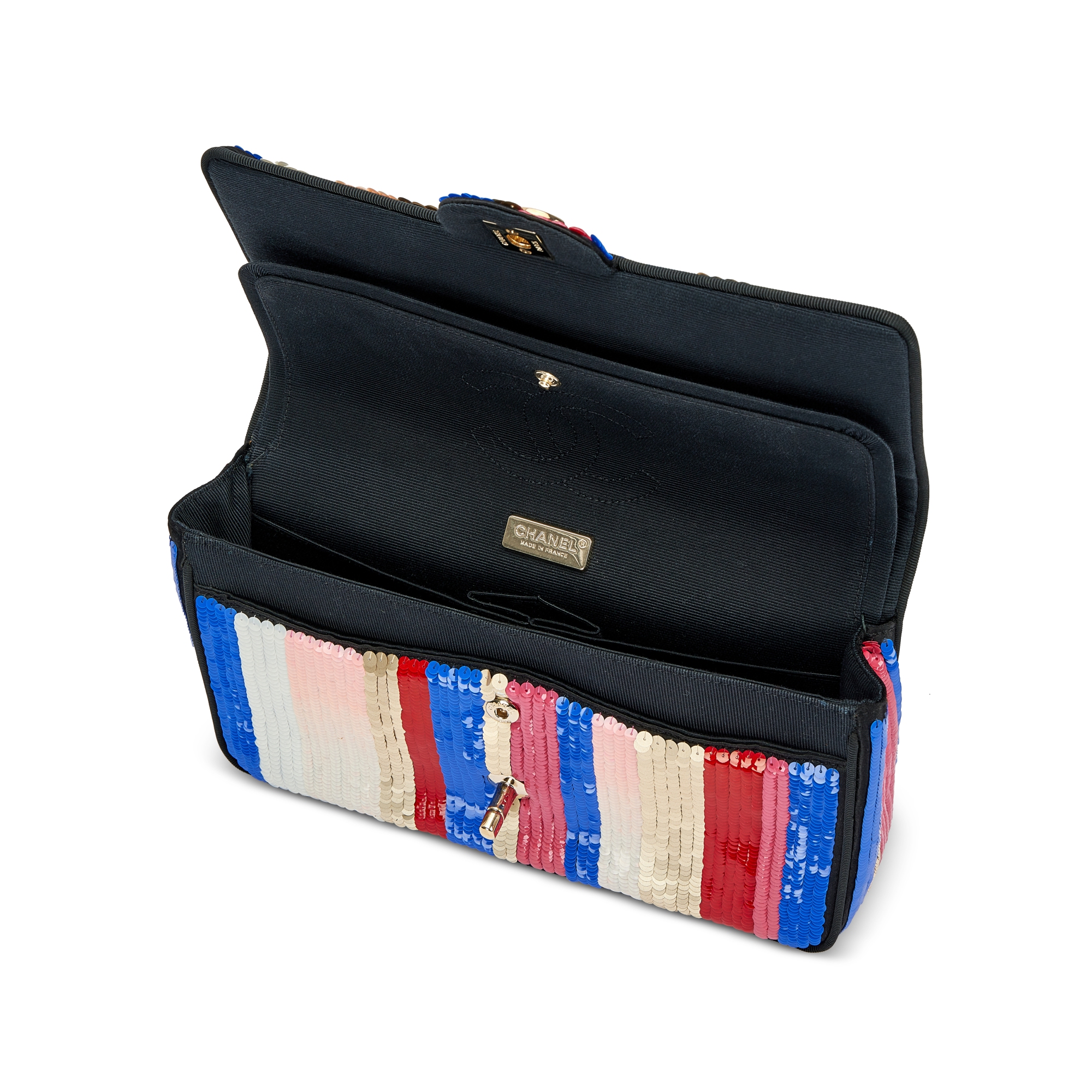 Chanel Blue, White, Red, Gold and Pink Sequin and Black Fabric Double Flap Bag Pale Gold Hardware, 2016This item is a limited edition from the Chanel Resort 2016 CollectionThe interior is lined with Black textile materialIncludes authenticity card and dust bagThis item is final sale and not eligible for return