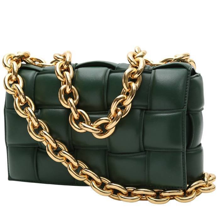 Elegant Bottega Veneta Cassette shoulder bag in green braided leather, hardware in gilt metal, one chain strap in gilt metal allowing the bag to be worn in the hand or on the shoulder or accross the body.