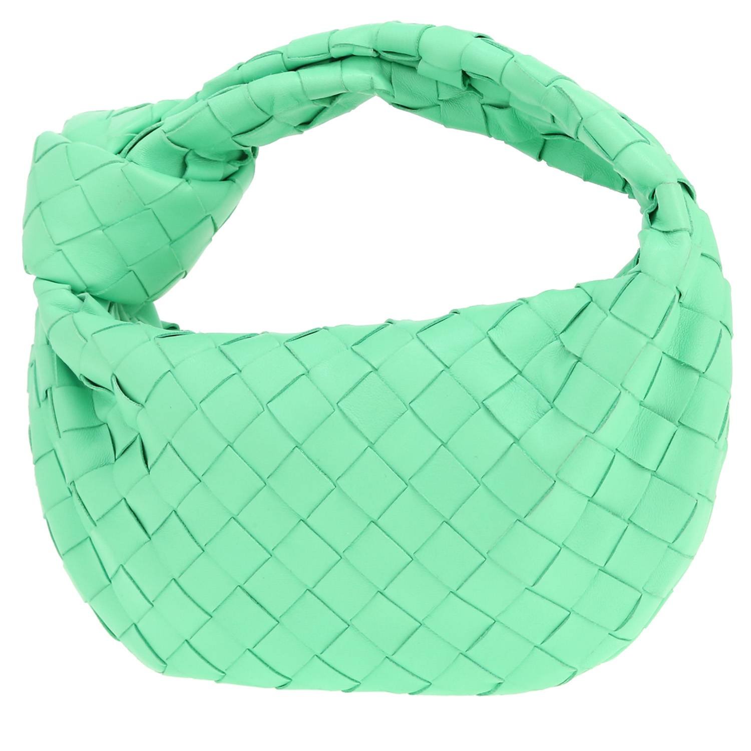 Superb Bottega Veneta Mini Jodie handbag in green braided leather, hardware in gilt metal, one handle in green braided leather allowing the bag to be worn in the hand.
