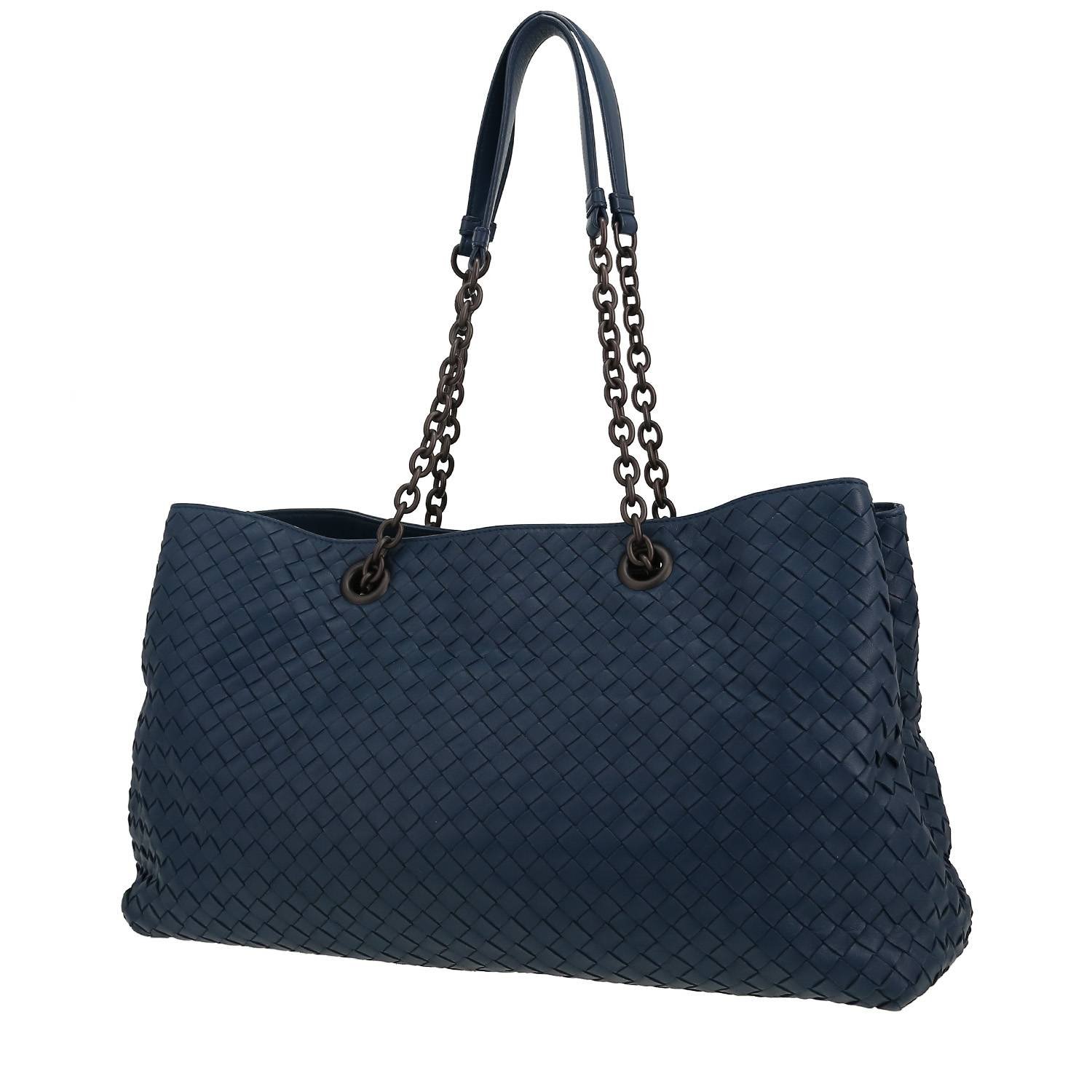 Beautiful Bottega Veneta shopping bag in blue intrecciato leather, double strap in blackened metal allowing the bag to be worn in the hand or on the shoulder.