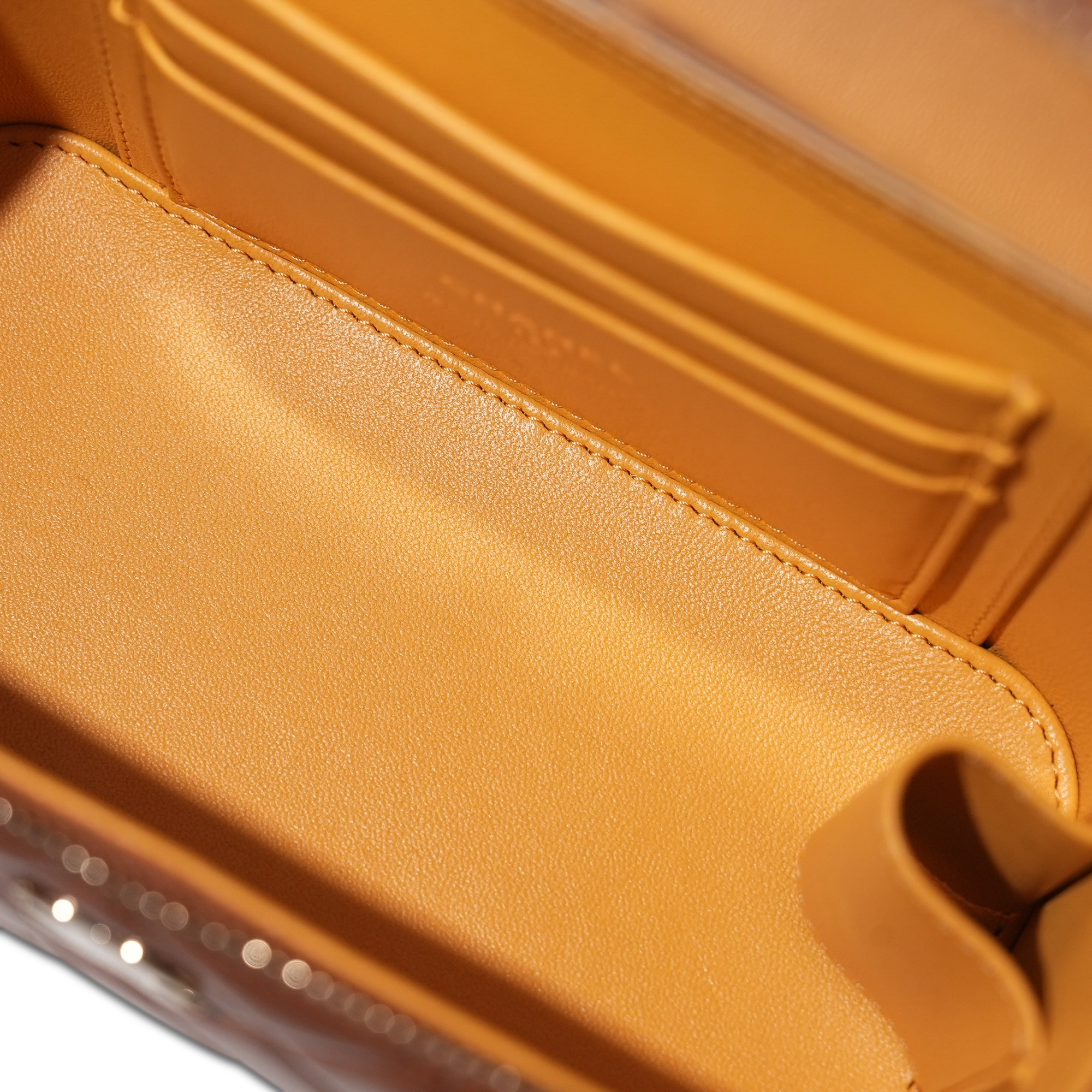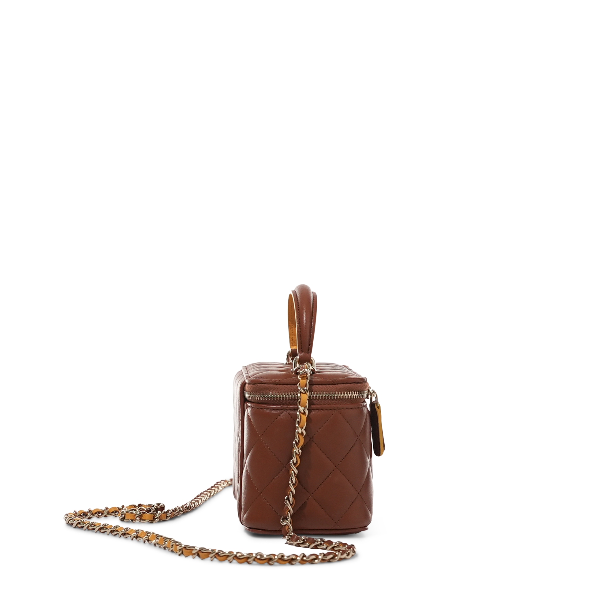 Brown and Yellow Quilted Lambskin Top Handle Long Vanity Case Pale Gold Hardware