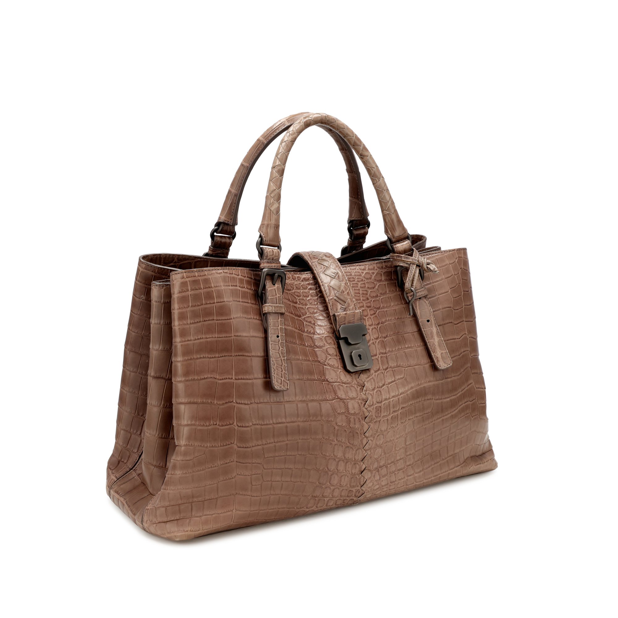 Bottega Veneta Brown Matte Crocodile Medium Roma Bag Ruthenium HardwareThis bag is lined with tonal microfiberIncludes key, key tie, care card, mirror, dustbag and boxThis item is final sale and not eligible for return