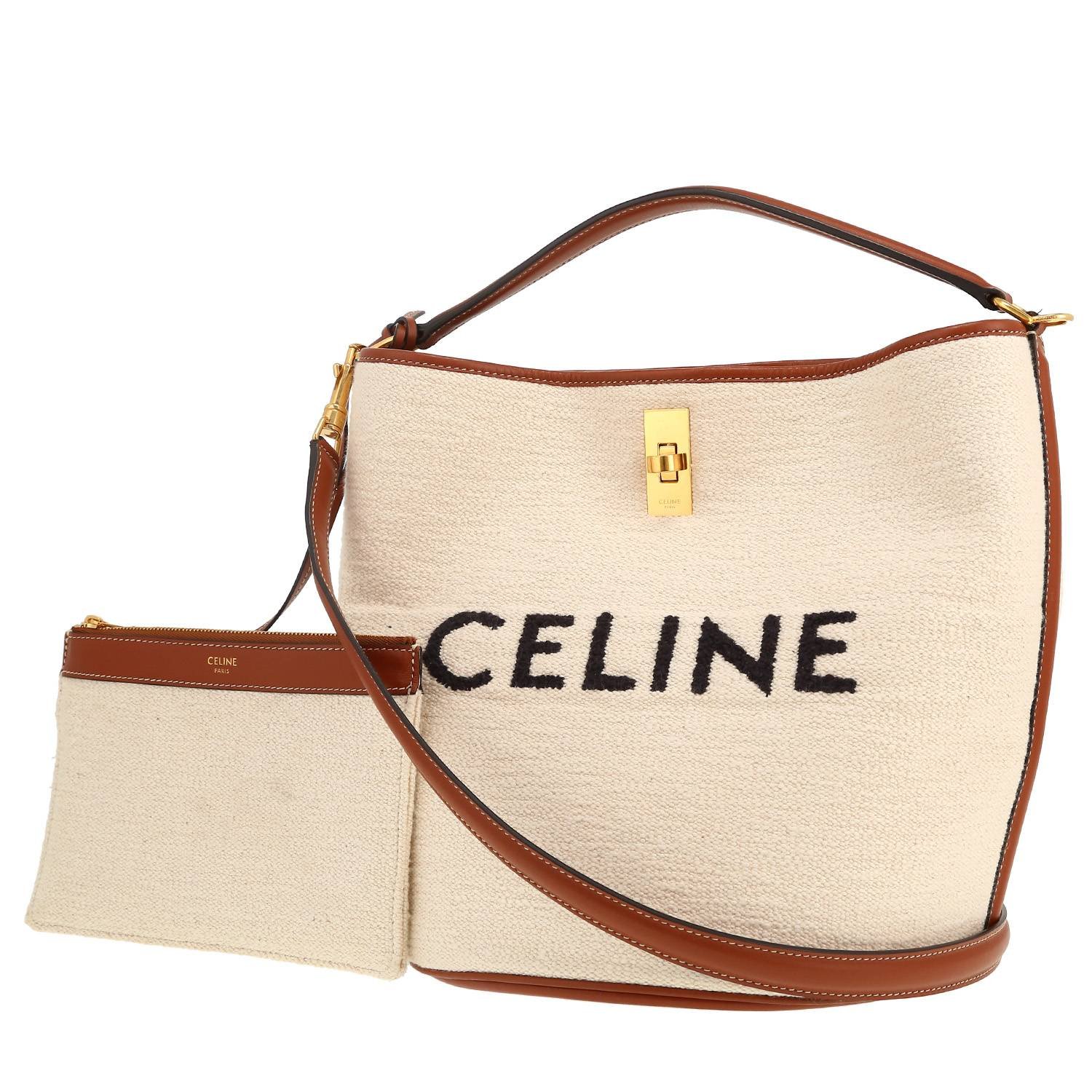 Exceptional Celine Seau 16 handbag in beige canvas, hardware in gilt metal, simple handle in brown leather, brown leather removable strap to be worn accross the body allowing the bag to be worn in the hand or on the shoulder.