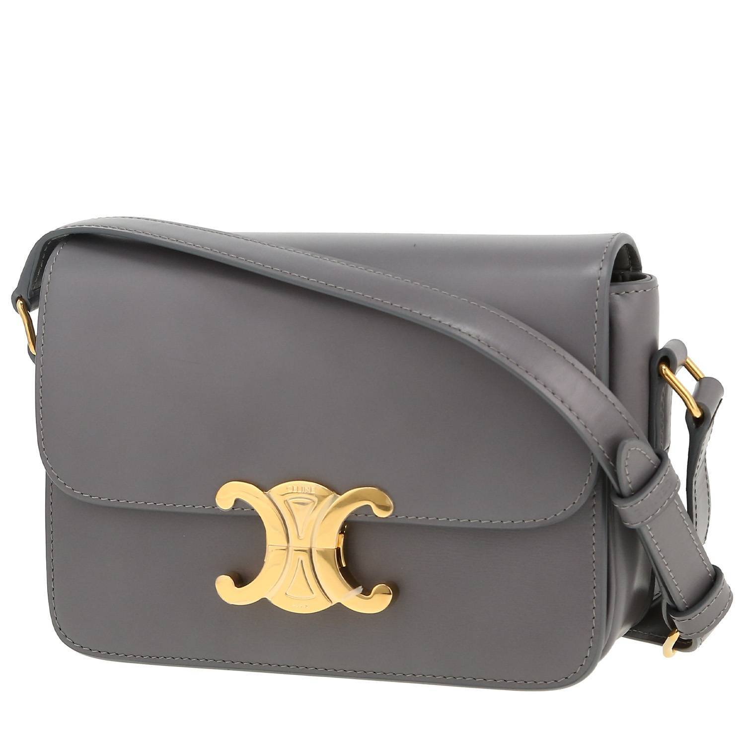 Unavoidable Celine Triomphe Teen shoulder bag in grey leather, hardware in gilt metal, one adjustable shoulder strap in grey leather allowing the bag to be worn on the shoulder or accross the body.