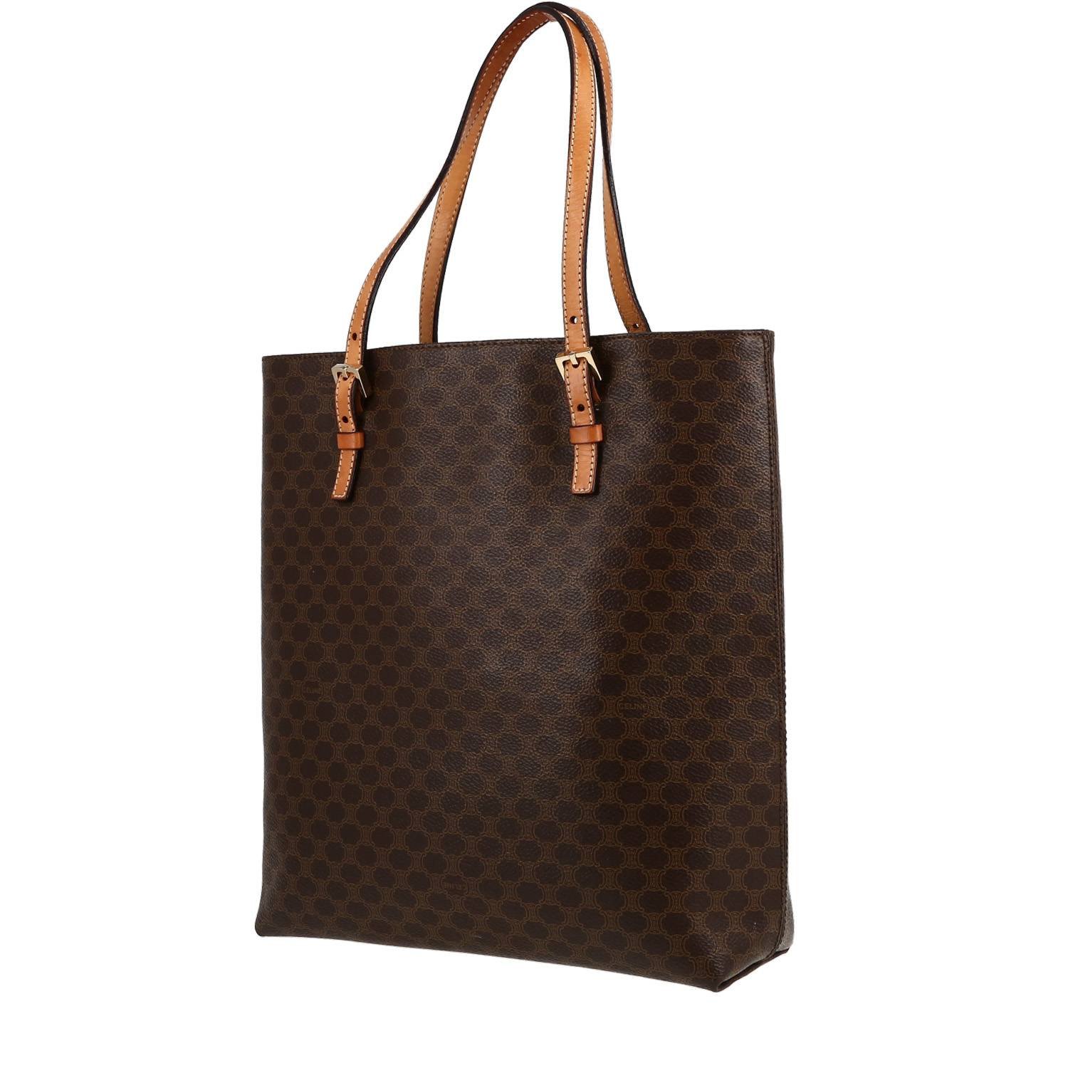 Timeless Celine Vertical shopping bag in brown logo canvas, hardware in gilt metal, double adjustable strap in natural leather allowing the bag to be worn in the hand or on the shoulder.