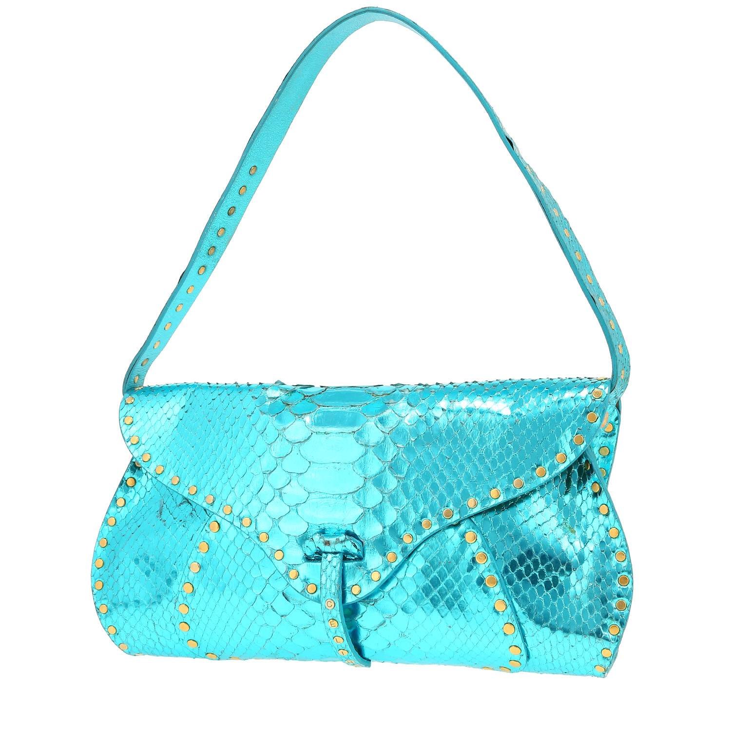 Charming Celine Vintage handbag in blue python, hardware in gilt metal, one strap in blue python allowing the bag to be worn in the hand or on the shoulder.