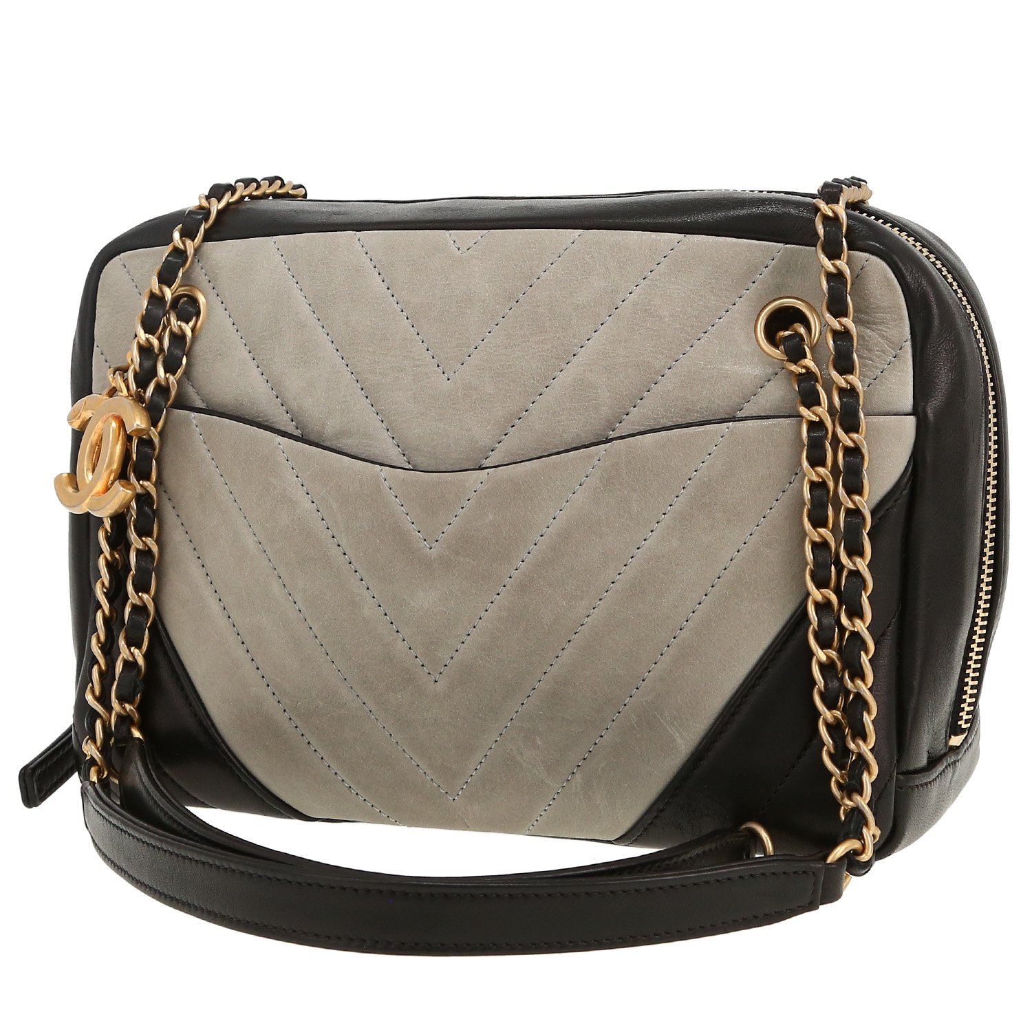 Delicate Chanel Camera handbag in grey and black chevron quilted leather, hardware in gilt metal, double chain strap in gilt metal interwoven with black leather allowing the bag to be worn on the shoulder.