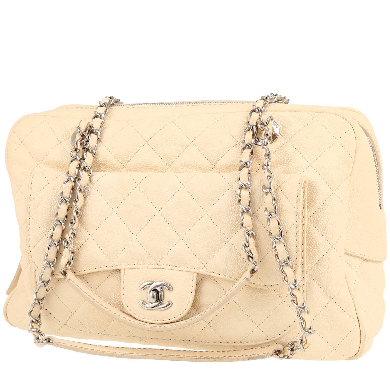 Wonderful large model Chanel Camera handbag in beige quilted leather, hardware in silver metal, two handles in silver metal interwoven with beige leather allowing the bag to be worn in the hand or on the shoulder.