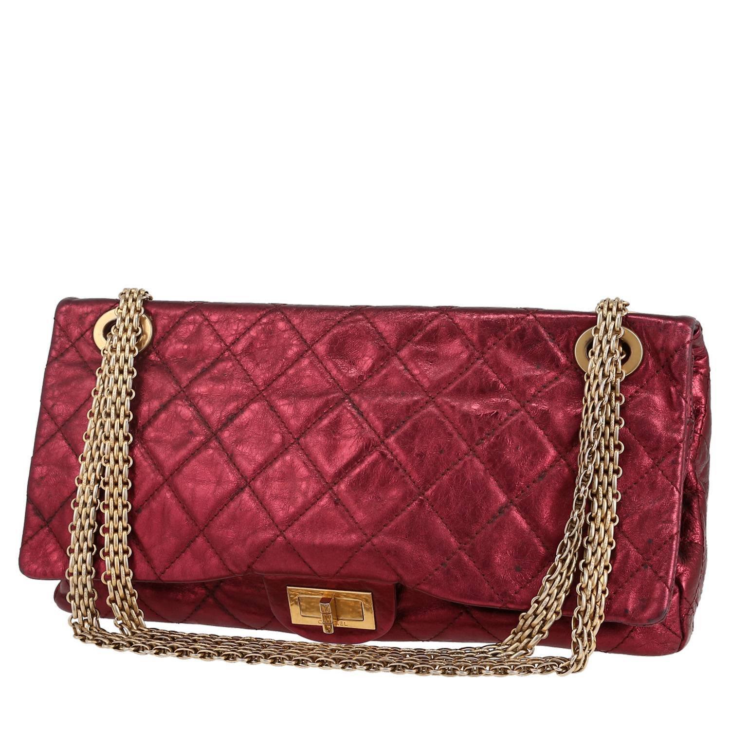Chic Chanel Chanel 2.55 handbag in metallic red quilted leather, hardware in gilt metal, one convertible chain strap in gilt metal allowing the bag to be worn in the hand or on the shoulder.