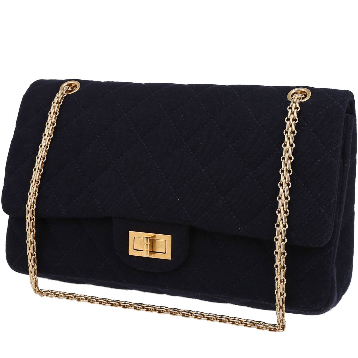 Magnificent Chanel Chanel 2.55 handbag in navy blue jersey, hardware in gilt metal, one convertible chain strap in gilt metal allowing the bag to be worn in the hand or on the shoulder or accross the body.