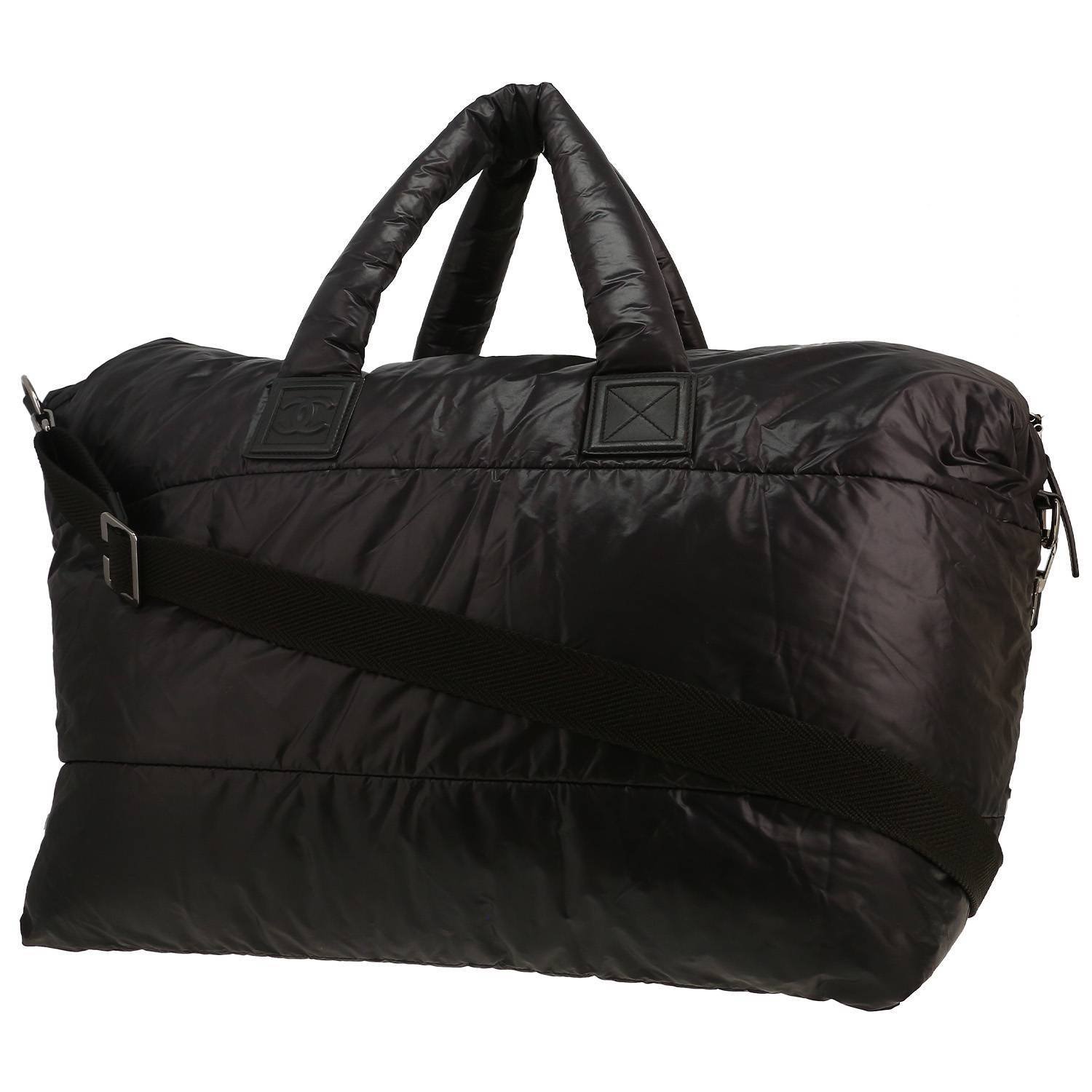 Beautiful Chanel Coco Cocoon shopping bag in black quilted canvas, hardware in silver metal, double handle in black canvas, one strap in black canvas allowing the bag to be worn in the hand or on the shoulder or accross the body.