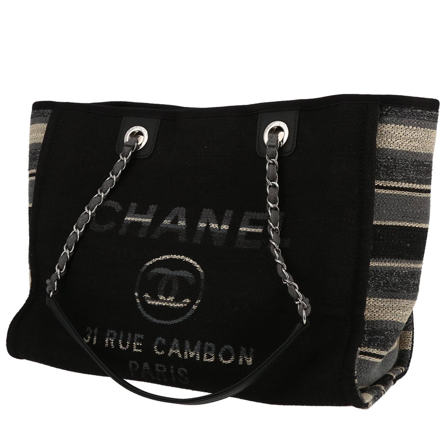 Practical Chanel Deauville shopping bag in black and grey canvas, hardware in silver metal, double chain strap in silver metal interwoven with grey leather allowing the bag to be worn in the hand or on the shoulder.