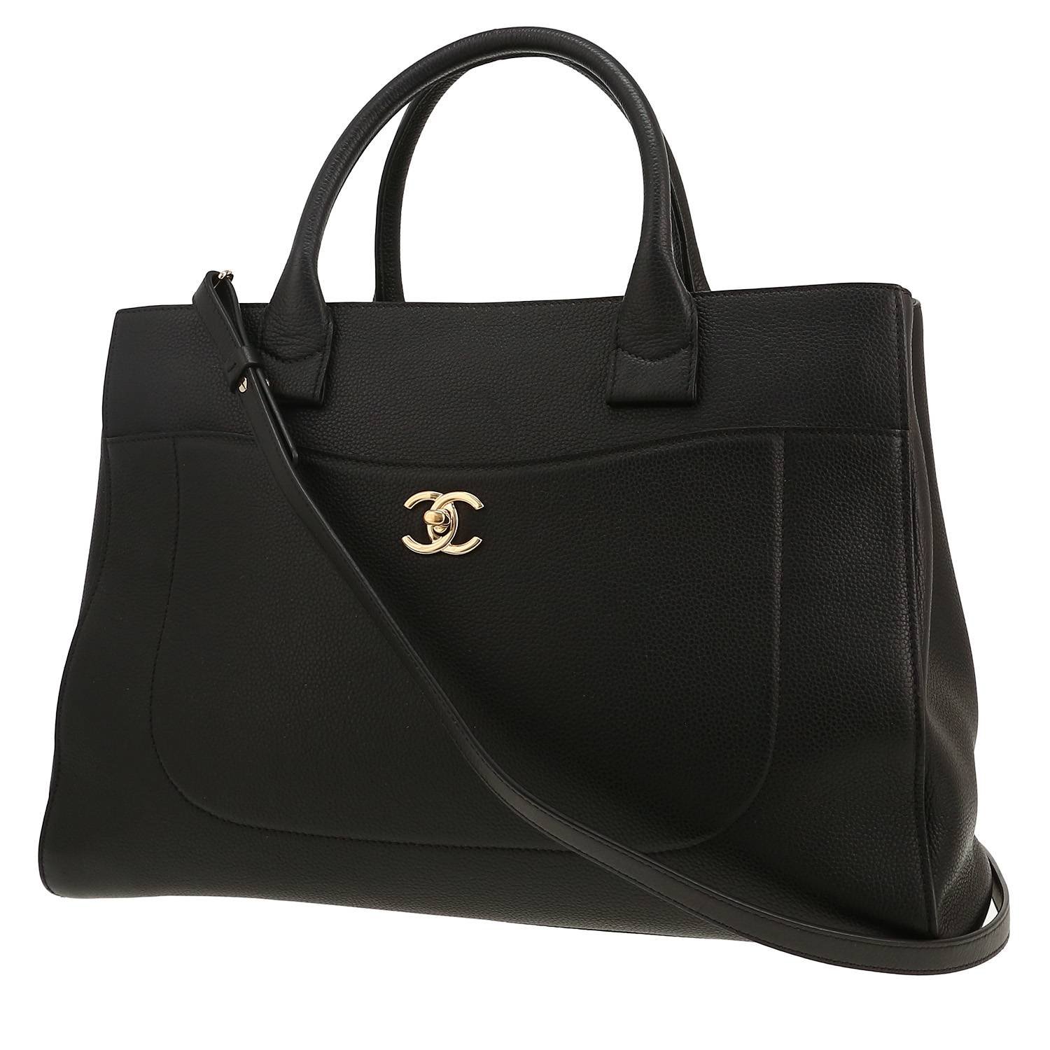 Charming Chanel Executive shopping bag in black grained leather, hardware in gilt metal, double handle in black grained leather, black leather removable strap to be worn accross the body allowing the bag to be worn in the hand or on the shoulder.
