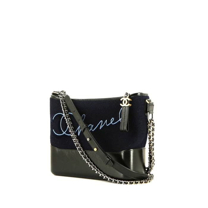 Superb Chanel Gabrielle Collection Paris-Hamburg shoulder bag in navy blue whool with pattern and black leather, hardware in gilt and silver metal , double chain strap in gilt and silver metal interwoven with black leather allowing the bag to be worn on the shoulder or accross the body.