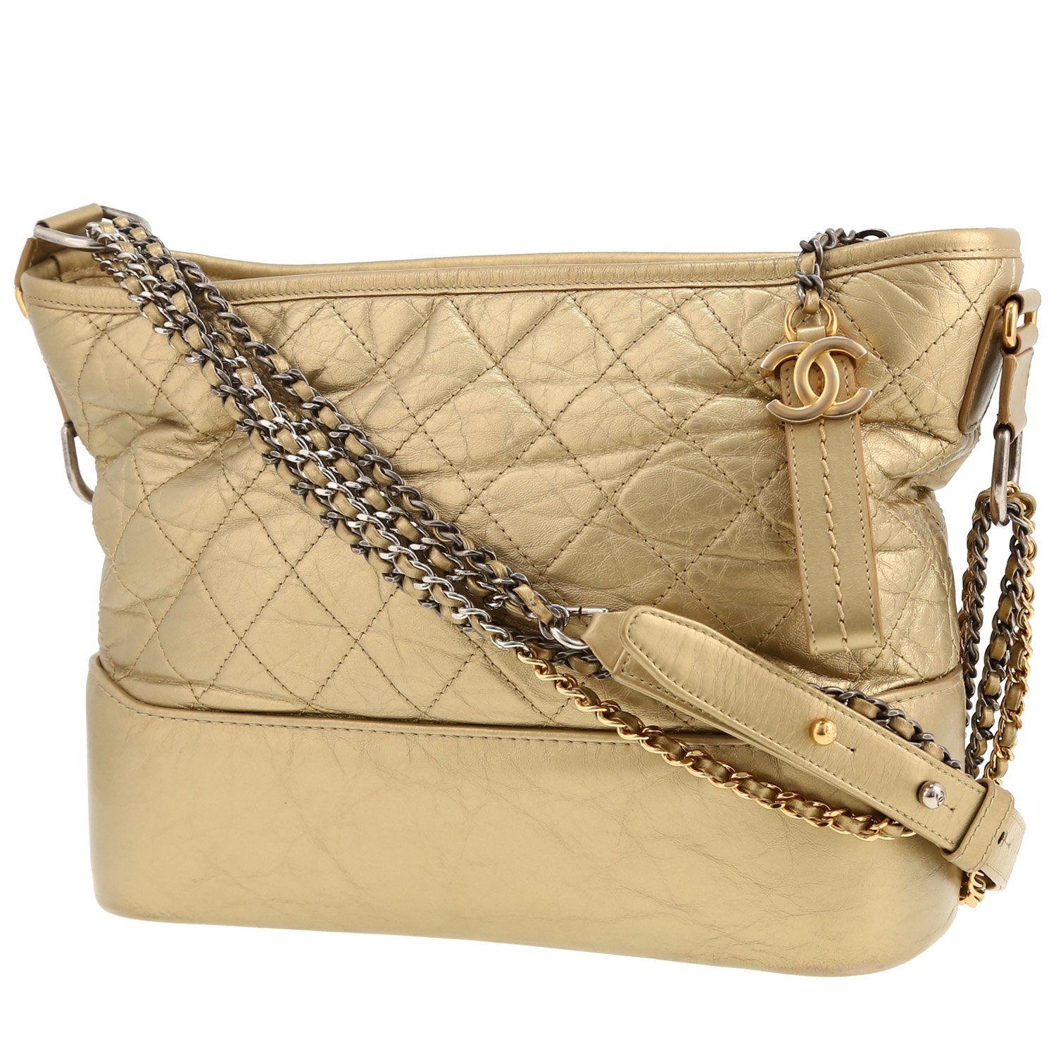Lovely medium model Chanel Gabrielle shoulder bag in gold quilted leather, hardware in gilt and silver metal, double chain strap in gilt and silver metal interwoven with gold leather allowing the bag to be worn on the shoulder or accross the body.