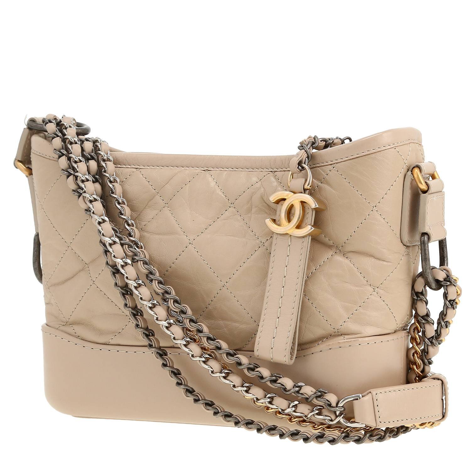 Elegant small model Chanel Gabrielle shoulder bag in beige quilted leather, hardware in gilt and silver metal, double chain strap in gilt and silver metal interwoven with beige leather allowing the bag to be worn on the shoulder or accross the body.