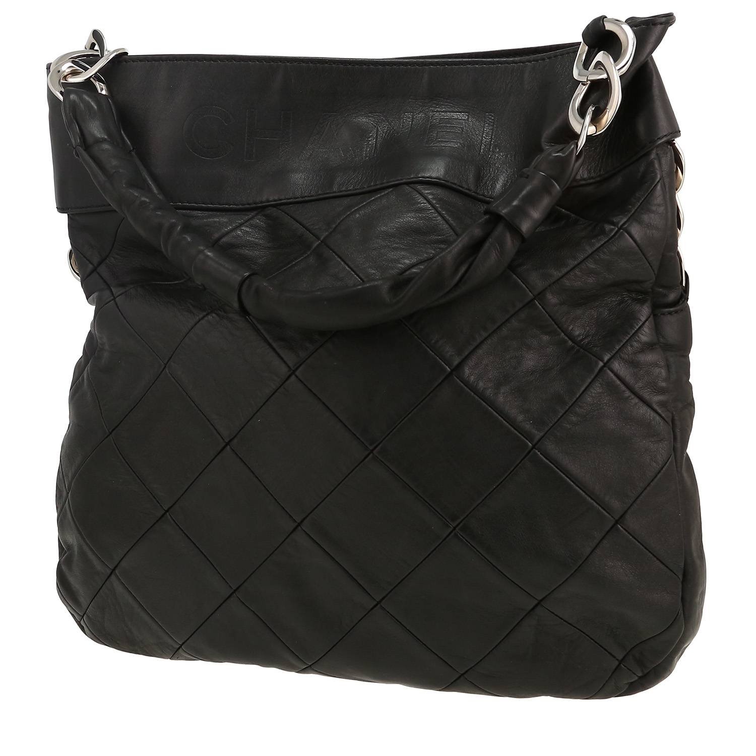 Chanel handbag in black quilted leather, hardware in silver metal, one strap in silver metal interwoven with black leather allowing the bag to be worn in the hand or on the shoulder.