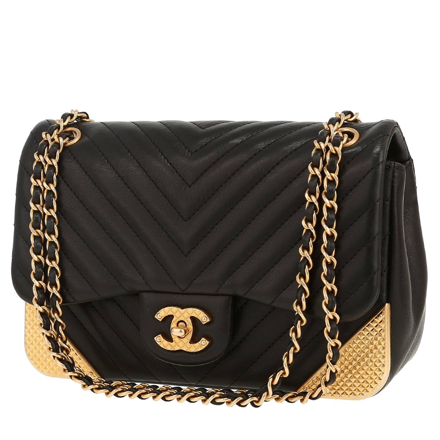 Wonderful Chanel Mini Timeless handbag in black chevron quilted leather, hardware in gilt metal, double chain strap in gilt metal interwoven with black leather allowing the bag to be worn in the hand or on the shoulder.