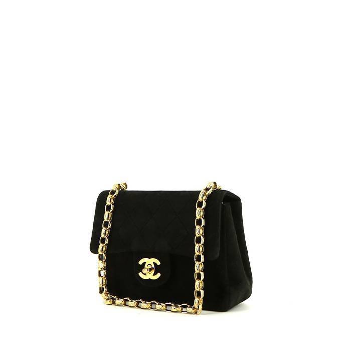 Chic Chanel Mini Timeless shoulder bag in black quilted suede, hardware in gilt metal, chain strap in gilt metal allowing the bag to be worn in the hand or on the shoulder or accross the body.
