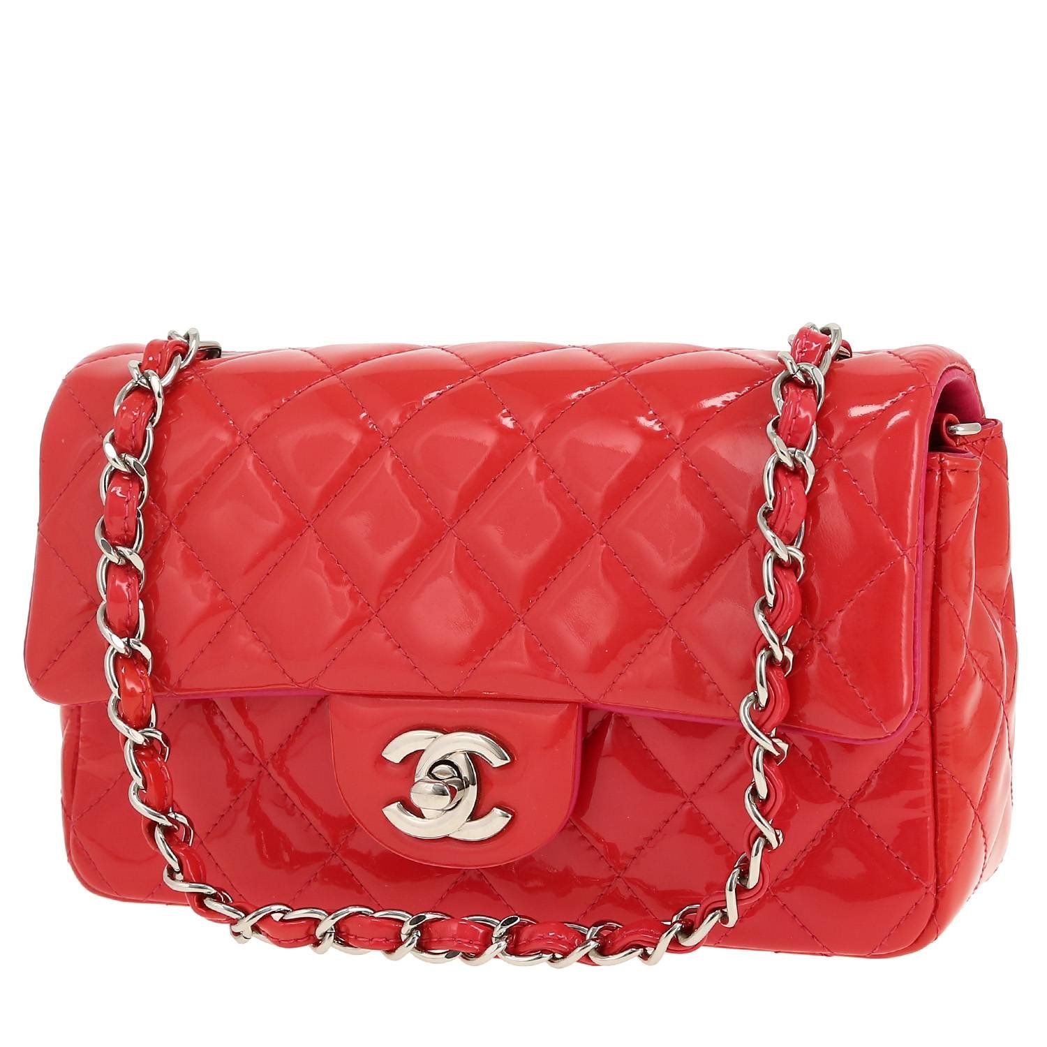 Wonderful Chanel Mini Timeless shoulder bag in red patent quilted leather, hardware in silver metal, one chain strap in silver metal interwoven with red leather allowing the bag to be worn on the shoulder or accross the body.