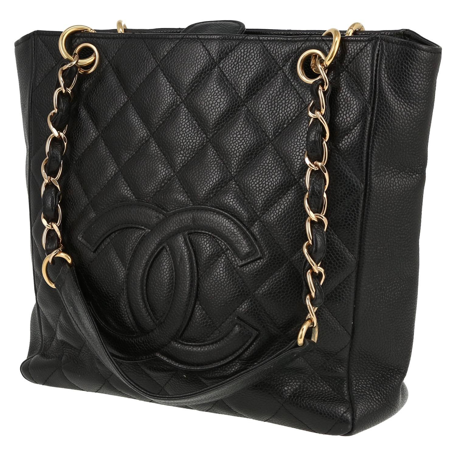 Unavoidable Chanel Petit Shopping handbag in black quilted grained leather, hardware in gilt metal, double chain strap in gilt metal interwoven with black leather allowing the bag to be worn in the hand or on the shoulder.