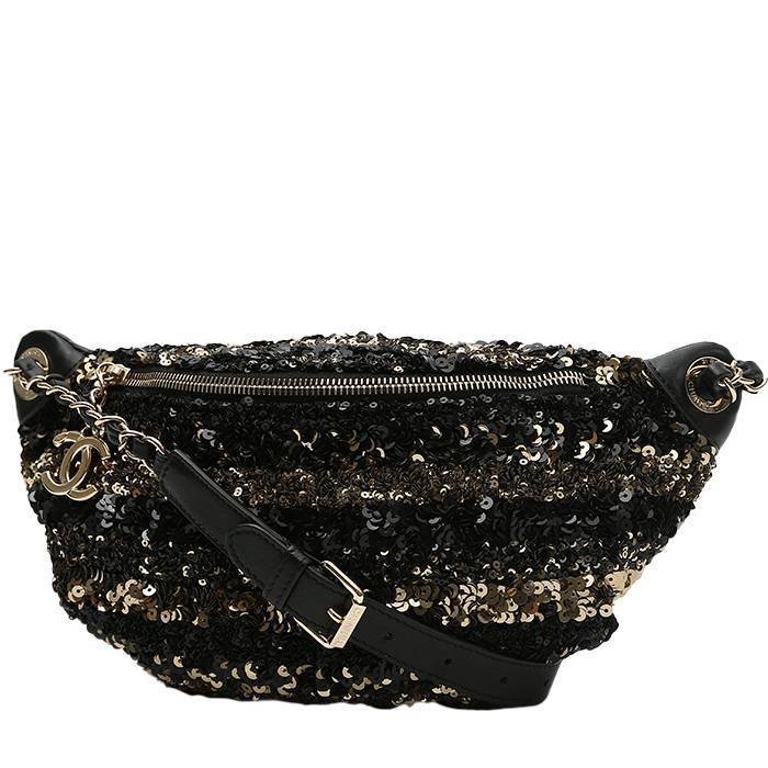 Surprising Chanel Pochette ceinture clutch-belt in black and gold paillette, hardware in gilt metal, one adjustable strap in black leather allowing the bag to be worn on the shoulder.