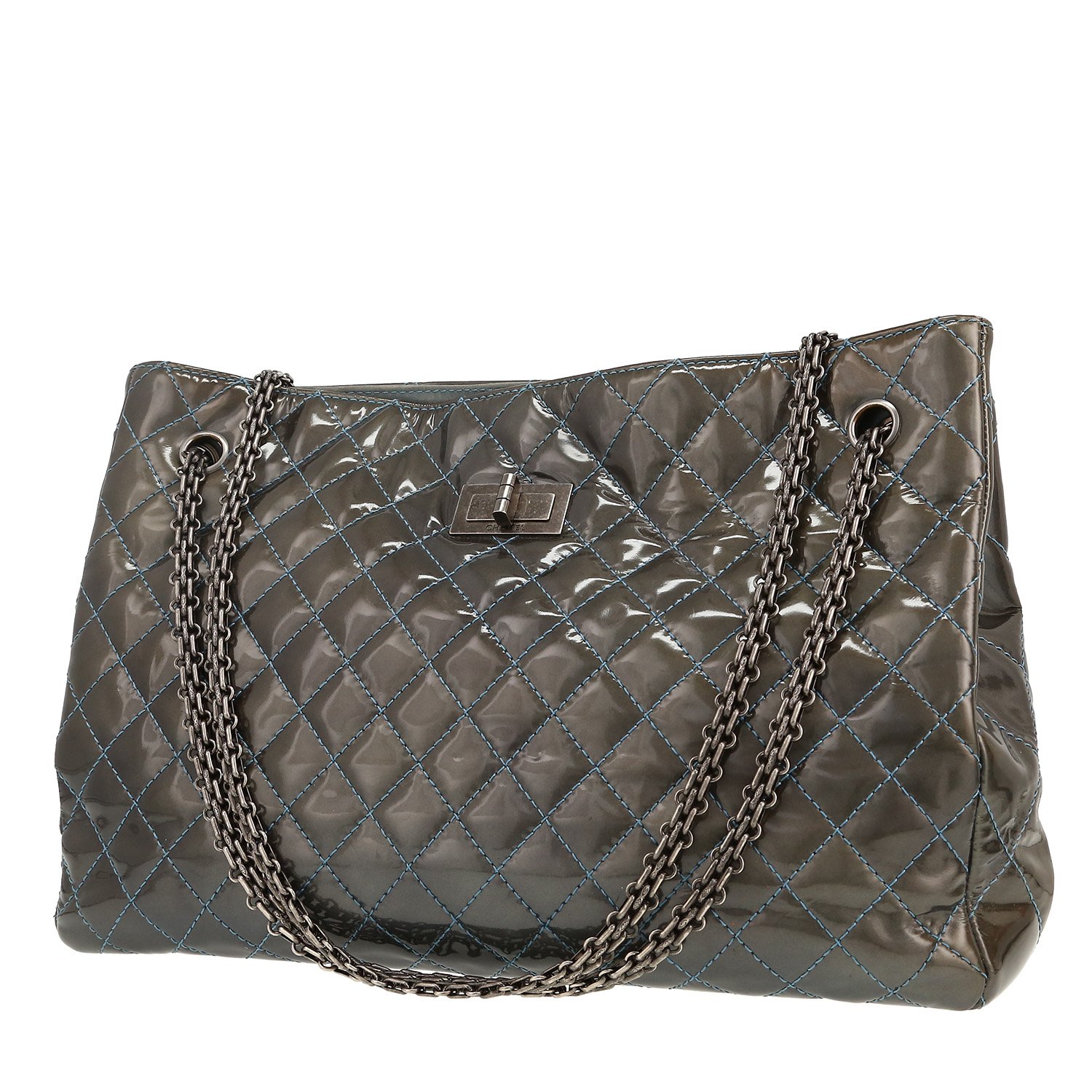 Unavoidable Chanel Shopping GST bag worn on the shoulder or carried in the hand in green quilted leather, hardware in blackened silver metal blue, stitchings, double chain strap in blackened silver metal allowing the bag to be worn in the hand or on the shoulder.