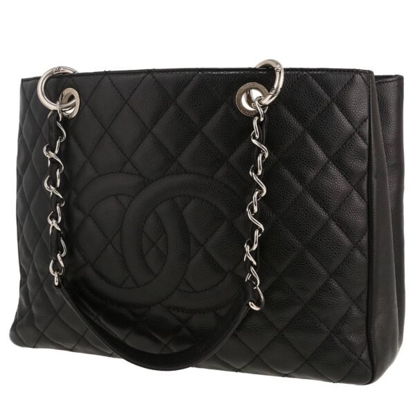 Wonderful Chanel Shopping GST handbag in black quilted grained leather, hardware in silver metal, double chain strap in silver metal interwoven with black leather allowing the bag to be worn in the hand or on the shoulder.
